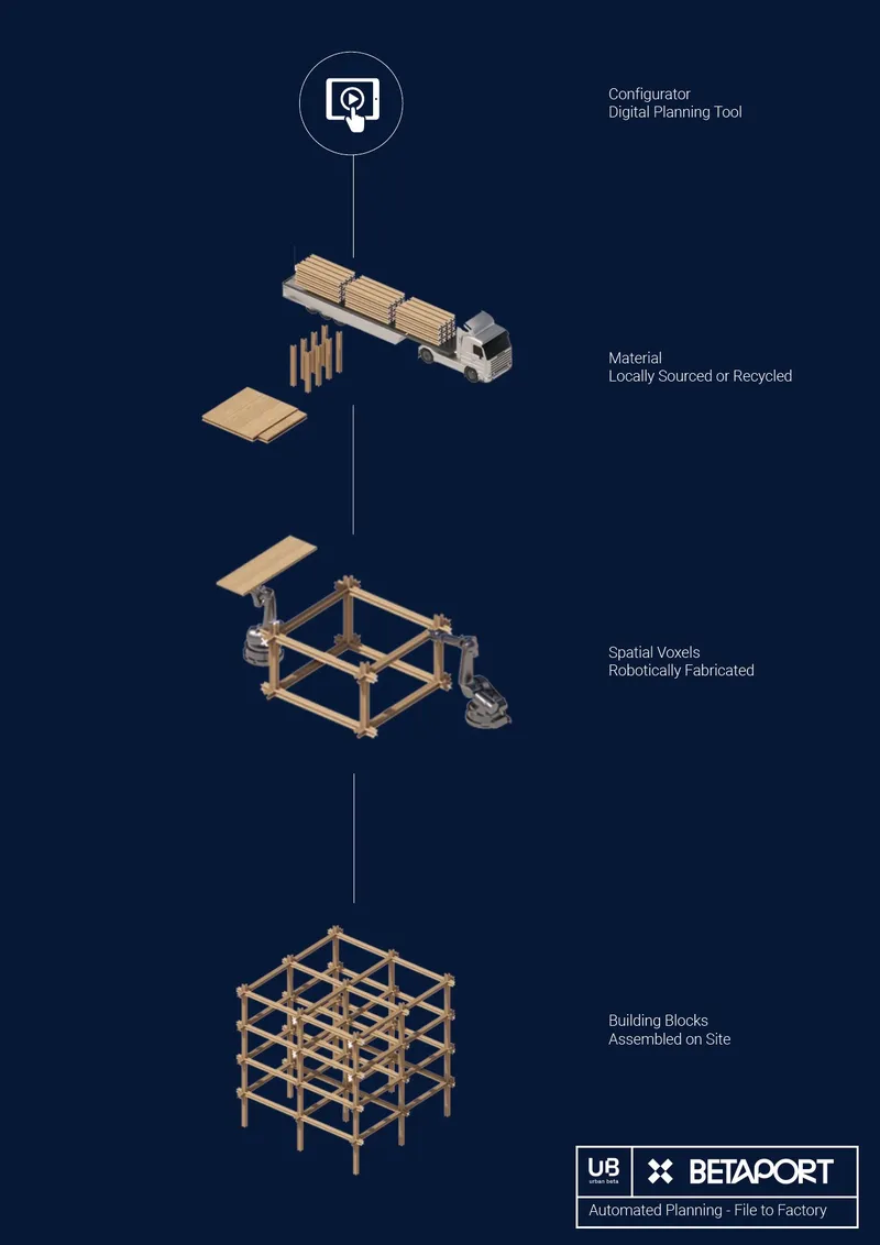 A digital design workflow was crafted to create modular, prefabricated building blocks that allow for scalability and fast construction on a multitude of locations. BetaPort comes with a digital planning tool: The BetaPort configurator. It serves as an interactive platform to connect various project stakeholders, decision makers, planners and users alike. The design process becomes an interactive act of participation and allows unseen information streams, relations and processes to be visualized, compared and optimized. Using machine learning and custom algorithms the configurator is designed for playful and efficient planning. It eliminates planning errors, anticipates building costs and creates production data.