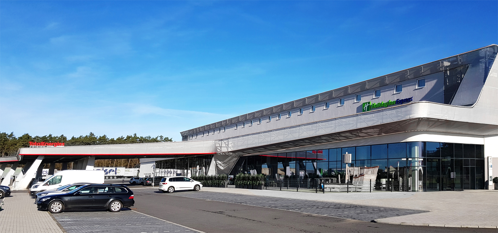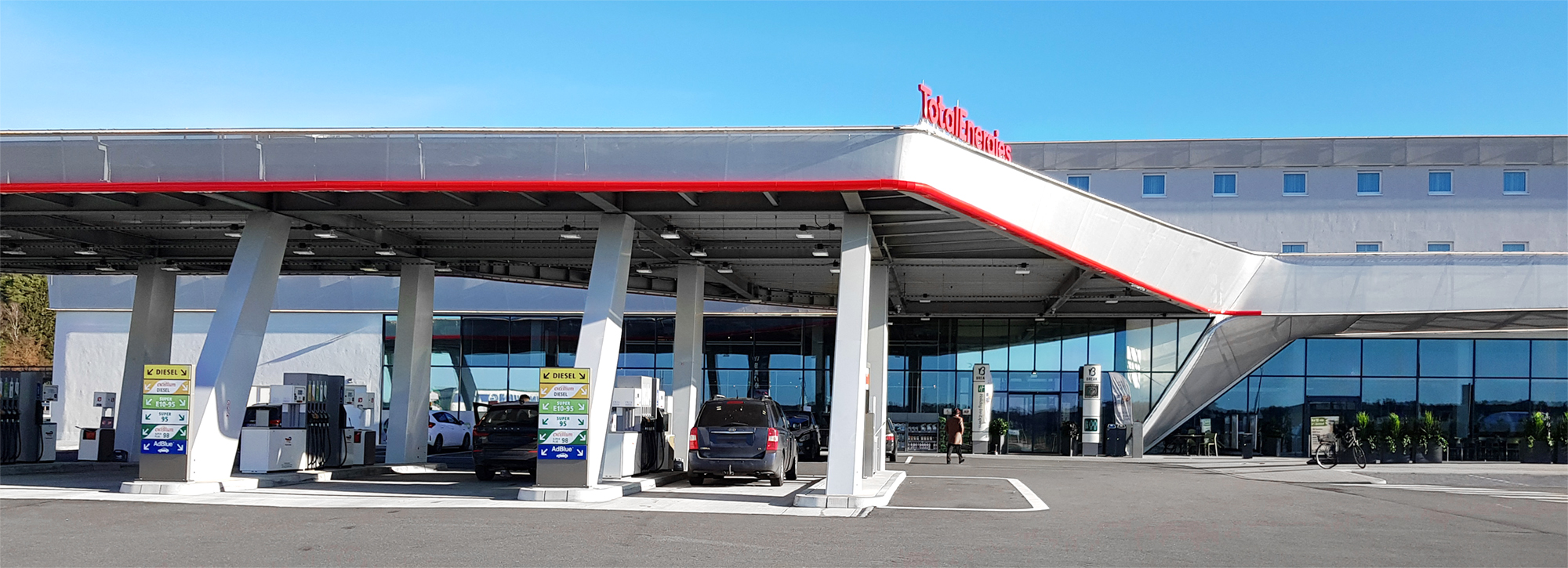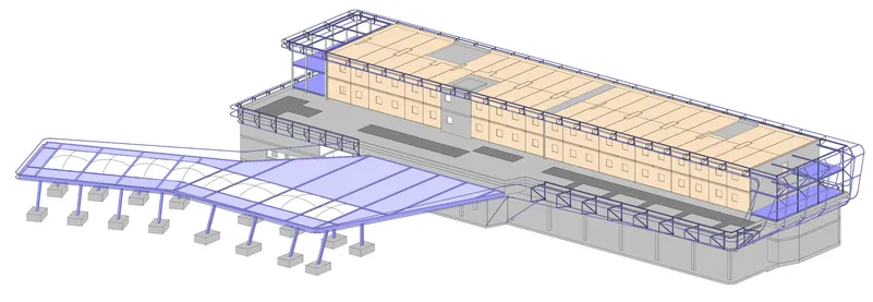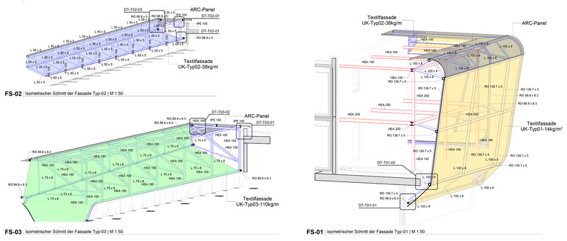 The steel construction of the gas station connects to the concrete structure of the main building and consists of a girder grid with a light band made of translucent membrane cushions. The three main elements and materials are connected by a membrane facade that extends form the attic of the gas station roof into the main building.