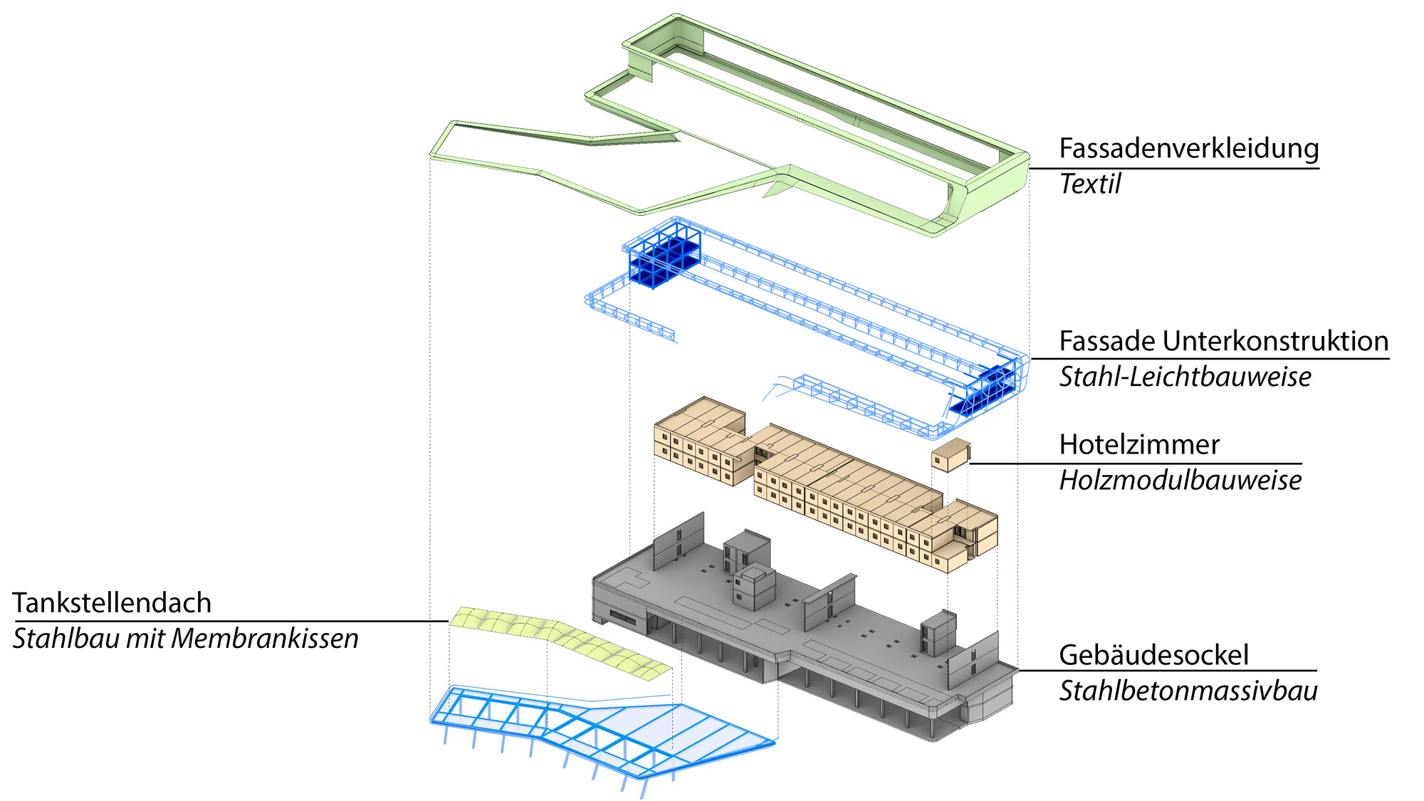 The structure consists of three main elements which differ both in their function and design. The main structure features a concrete structure on the first floor (gastronomy) and two floors of timber modules on top of it (hotel area). Each of these modules equals one room cell which is completely prefabricated and stacked on site.