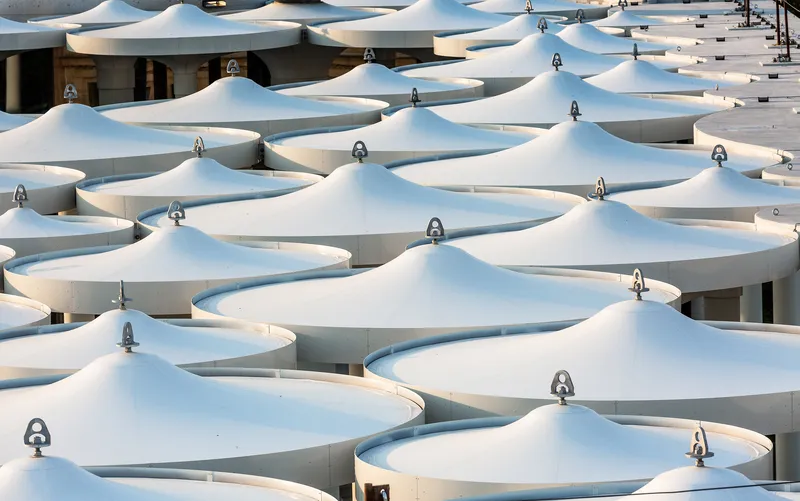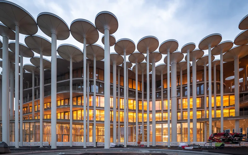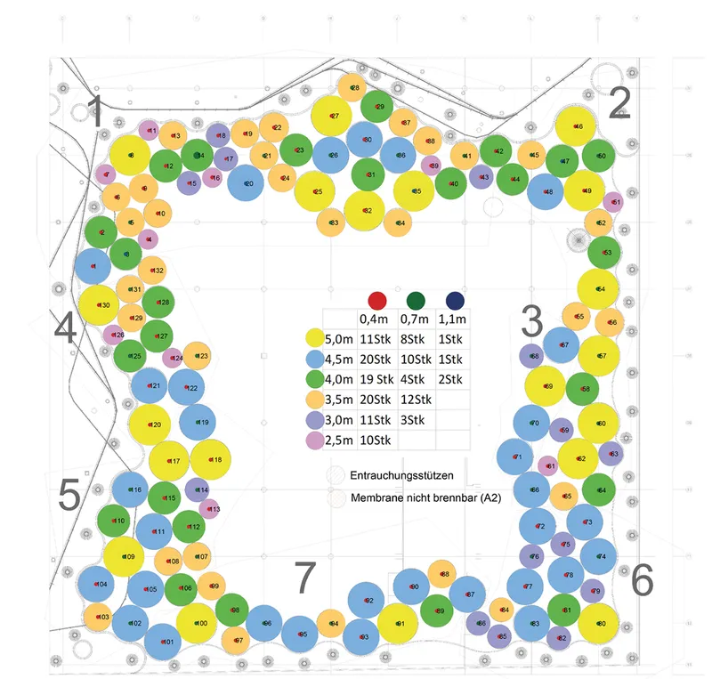 The mushroom-head-shaped canopies are covered with a PTFE/glass membrane on both the upper and lower sides and are attached to the upper end of 22 m high spun concrete columns. The diameters of the individual canopies vary between 2.5 m and 5.0 m.