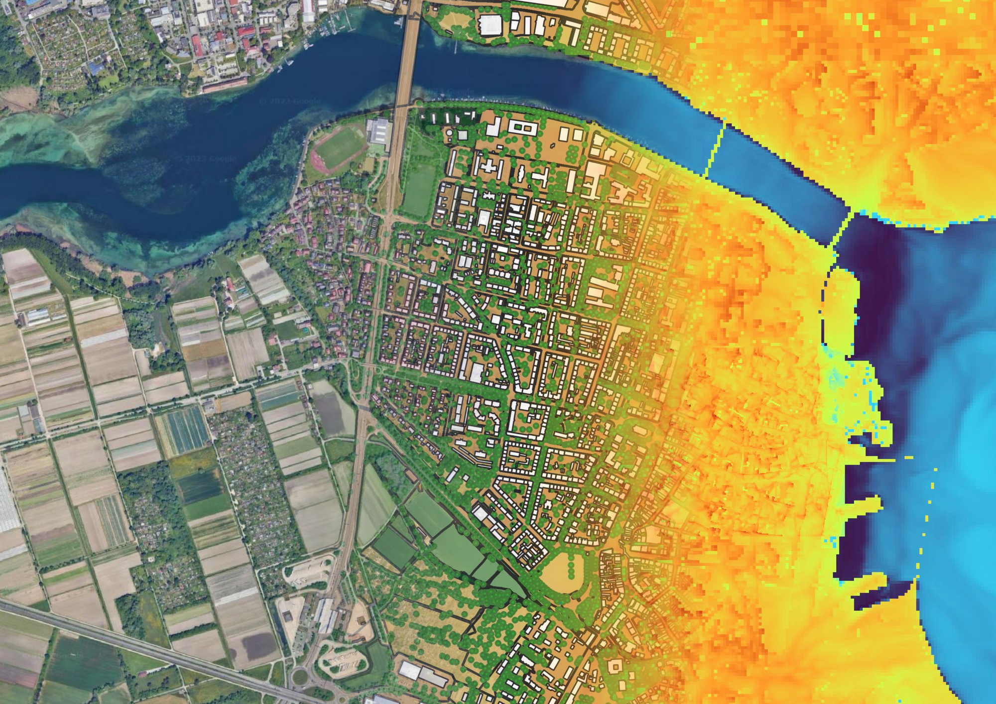 Our reference: In a case study commissioned by the city of Konstanz within the CoKLIMAx research project (Application of COPERNICUS data for climate-resilient urban planning, 2021-2024), the capabilities of the microclimate simulation platform with PALM-4U are demonstrated. The realistic urban configuration includes all typical features of urban complexity required for a physically grounded urban climate simulation. Model data is generated from various digital and analog data sources such as the city model in LOD2 quality, geoinformation from the Konstanz city administration, and point cloud-based information from LiDAR data. Urban climate simulations are calculated for static (clear-sky approximation) and dynamic climate conditions, with the latter being linked to a regional numerical weather prediction model (COSMO-DE) from the German Weather Service (DWD).