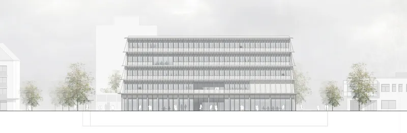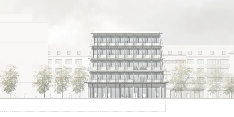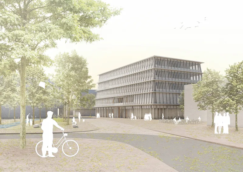 The new Waldkraiburg town hall is a five-story building that features a hybrid timber construction.