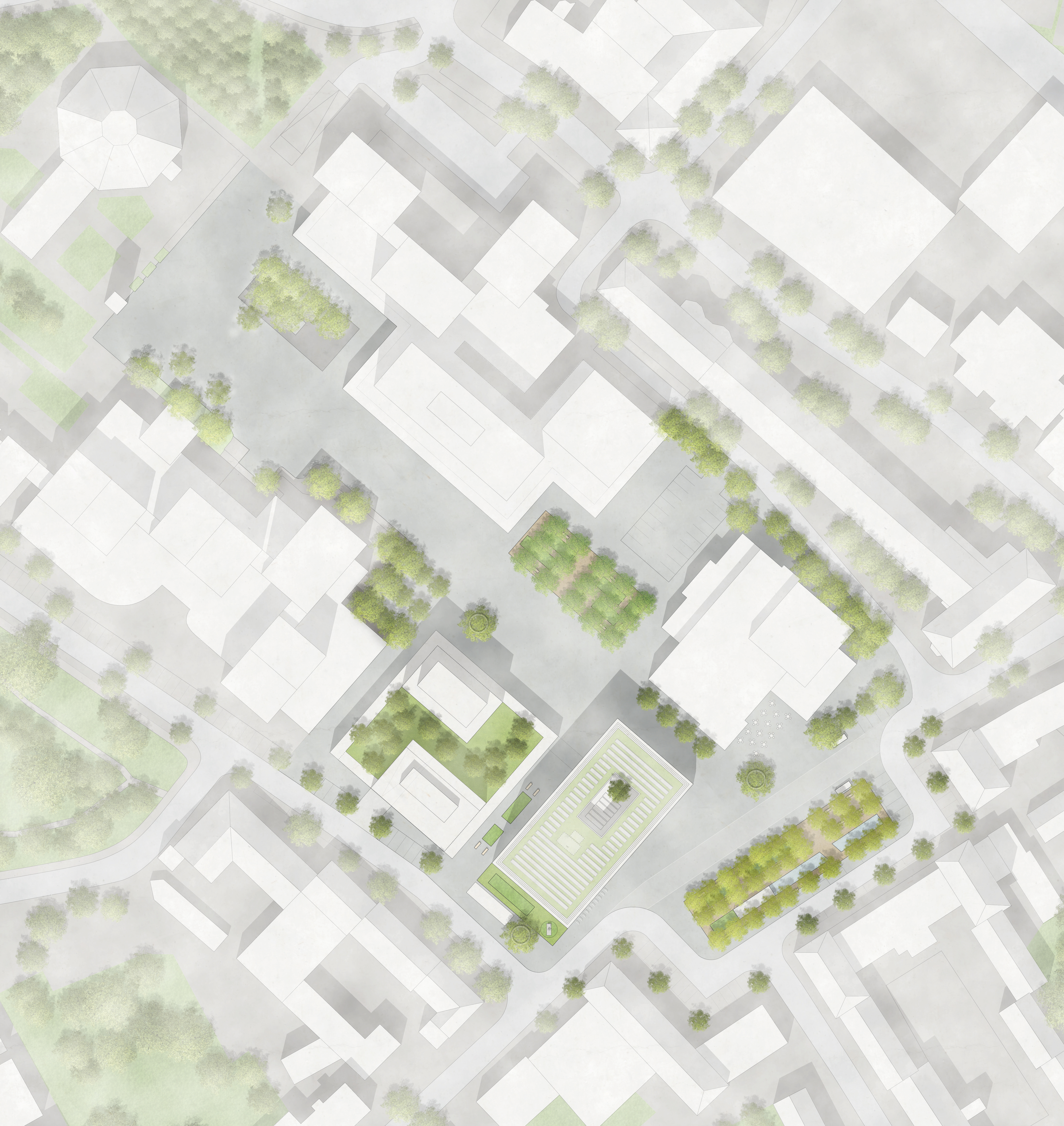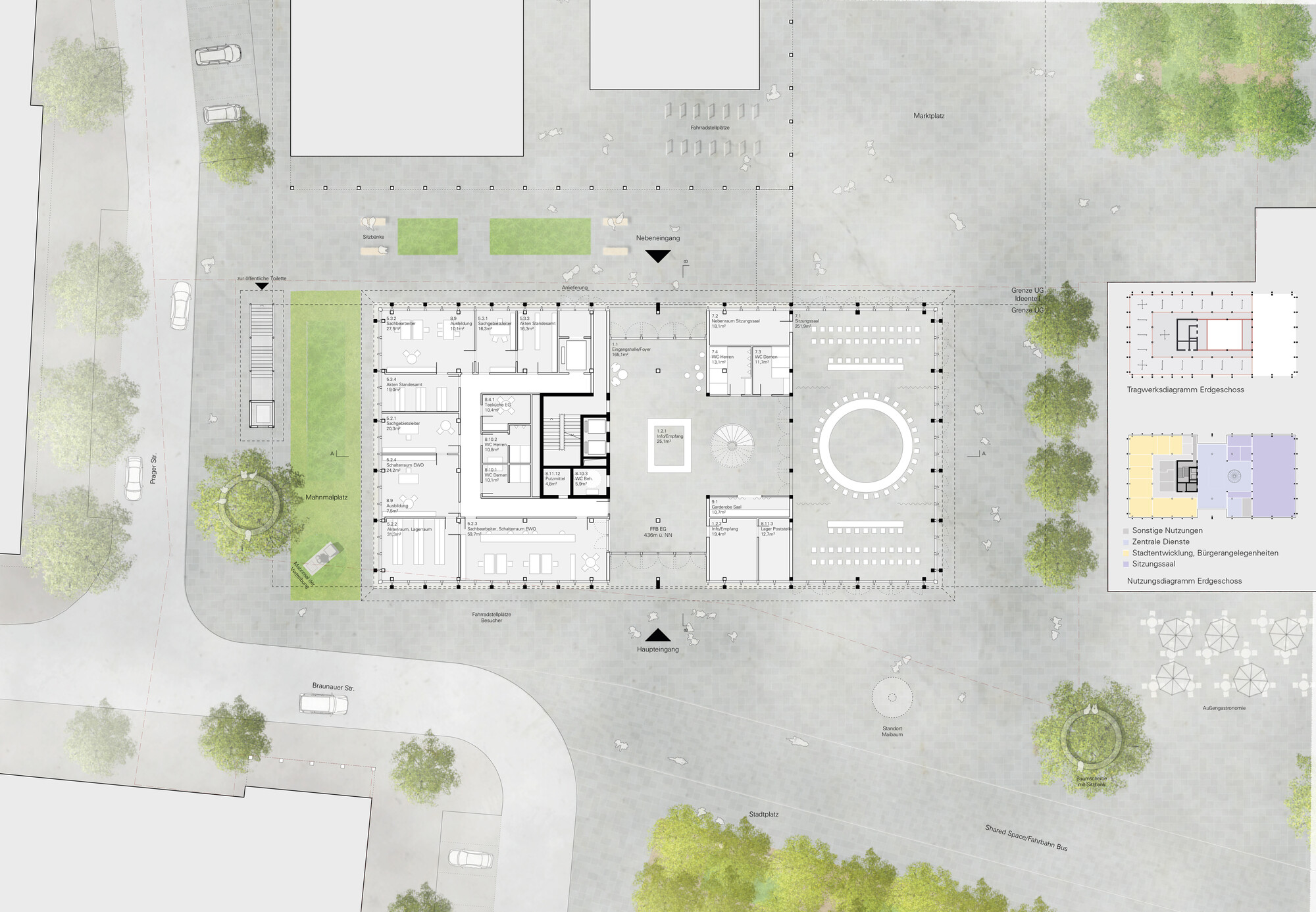 The structure rests on a reinforced concrete basement with a watertight floor slab. The main focus was on a high degree of prefabrication to ensure a short construction time and the use of CO2-neutral materials. The construction concept emphasizes minimal usage of concrete and maximal utilization of timber. For components that require concrete for structural, physical, or durability reasons, a high proportion of RC aggregate is used.