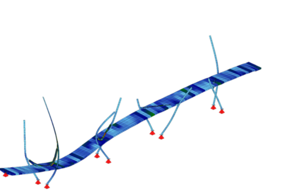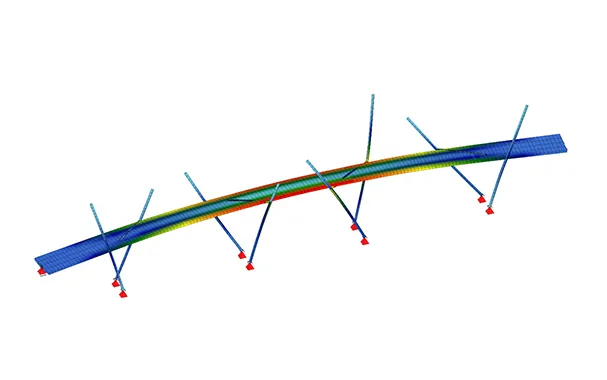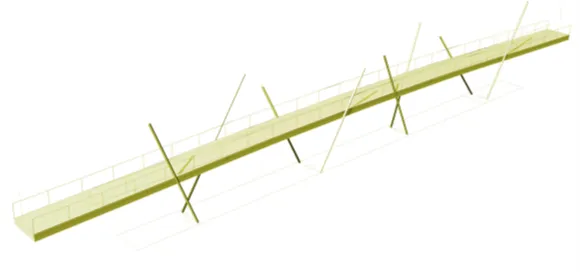 The Baunach Bridge now has a new pedestrian bridge that comprises of five continuous girders. The edge spans have a width of approximately 8 meters, while the main ones have a width between 10 and 11 meters. The bridge's superstructure is a lightweight steel box girder with a height of 40 cm and a sheet thickness of 10 mm. The superstructure is attached to the columns with welded-in cross beams that short-circuit the horizontal forces, reducing the impact of column inclination on the system. The supports are connected to the concrete stubs, which develop from the pile head beams and are articulated. In the transverse direction, the superstructure acts as a single-span girder with a span of 47 meters, while the change in length due to temperature is released at the western abutment. The foundation uses bored piles with a diameter of 60 cm, embedded in the load-bearing sandstone, which rises in the abutment area after approximately 10 meters. The foundation in the river is done in the flow shadow of the historic piers. With a total mass of around 25 tonnes, the superstructure can be lifted into place in two parts and welded to the "pusher supports" using a mobile crane. Finally, the assembly joint is welded in the center of the field, and the welding opening at the top is closed.