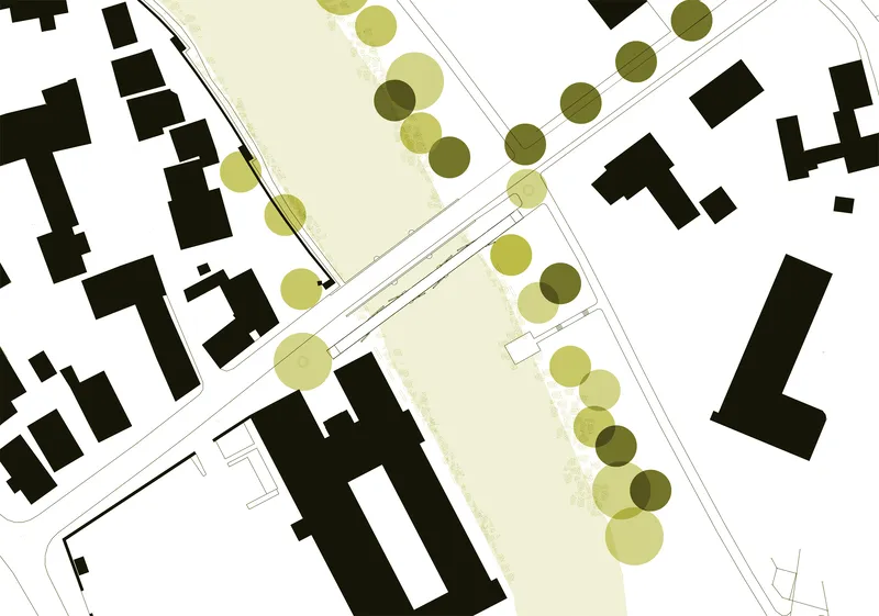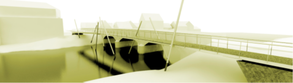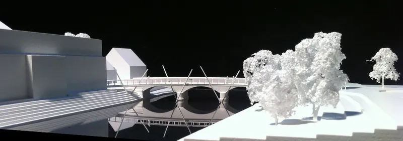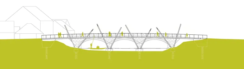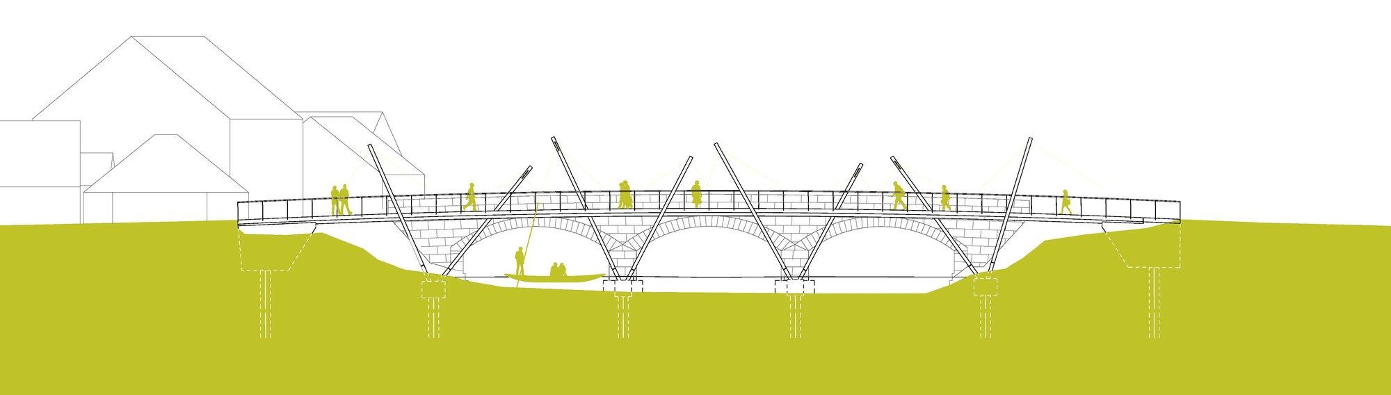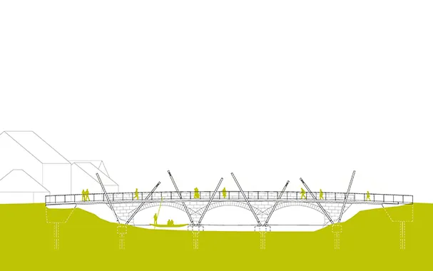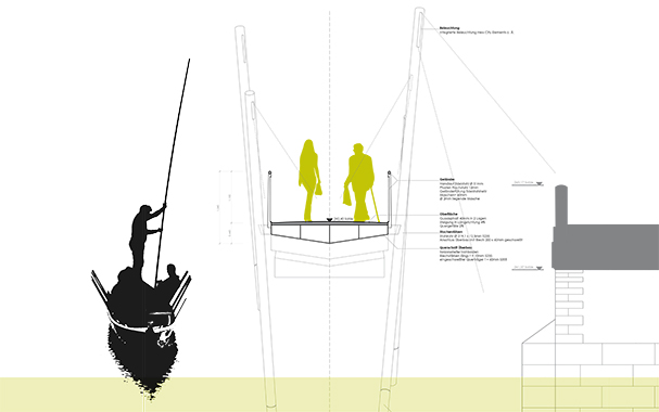 The silhouette of the new footbridge's design is reminiscent of the steering rods of a raft or punt, which are the most original form of transportation in shallow waters.