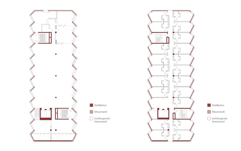 A mixed structural concrete frame and solid brick construction allows for high flexibility in the future. Overall, the structural design is highly focused on economic efficiency.