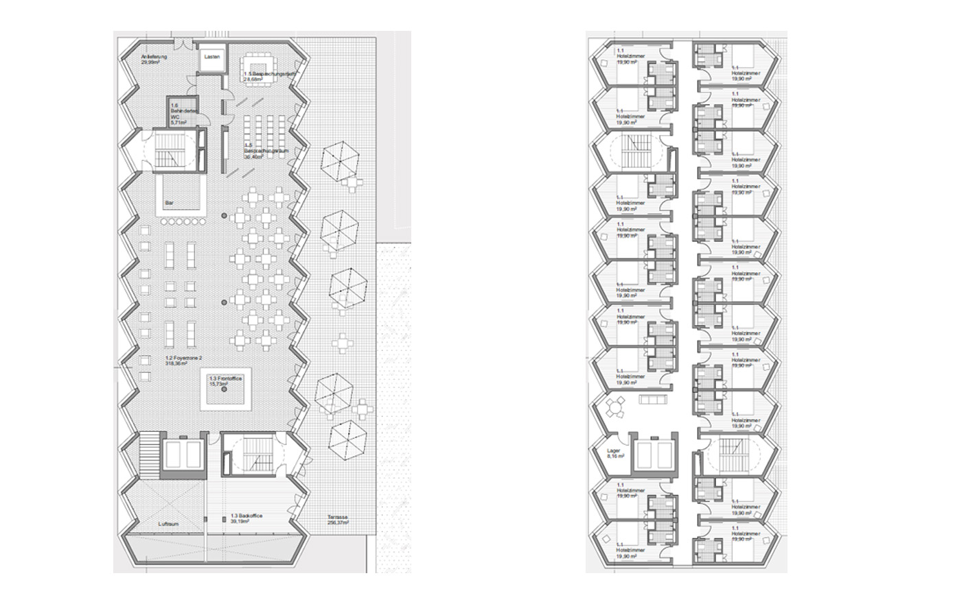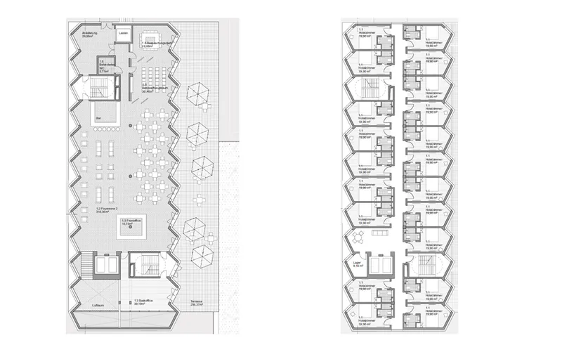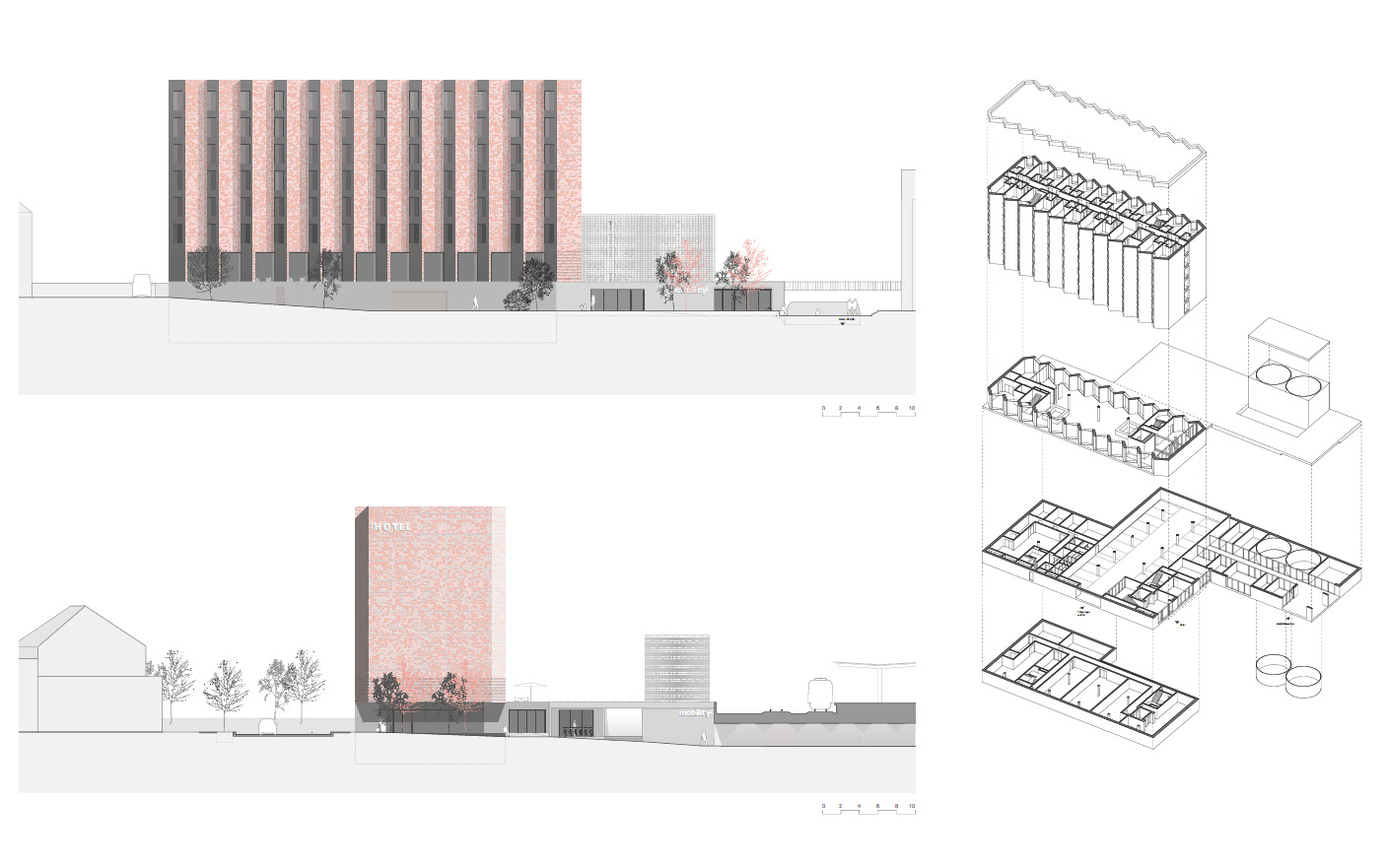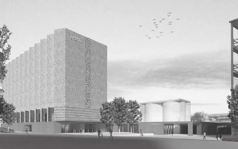 The design of a compact and prominent 7-storey hotel building is the answer to a heterogeneous urban context which meets the different requirements of the competition.
