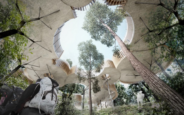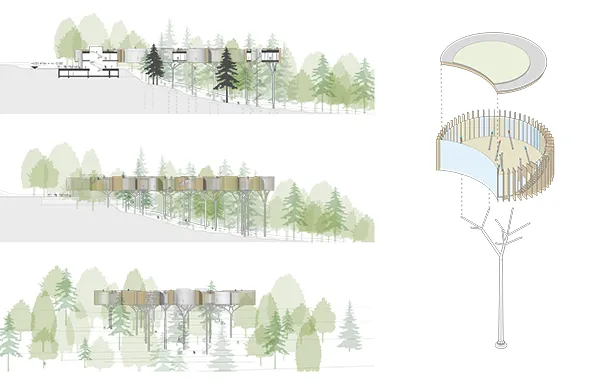 Respectfully it gives nature the stage as gentle tourism does. To this effect it is no landmark yet a reasonable and representative centre for the Black Forest national park. The concept is focused on a high level of interaction between building and forest. Similar to the illustration of trees in floor plans the building consists of circular parts: “The tree modules”.
