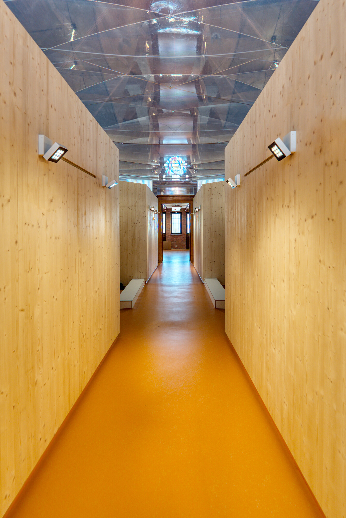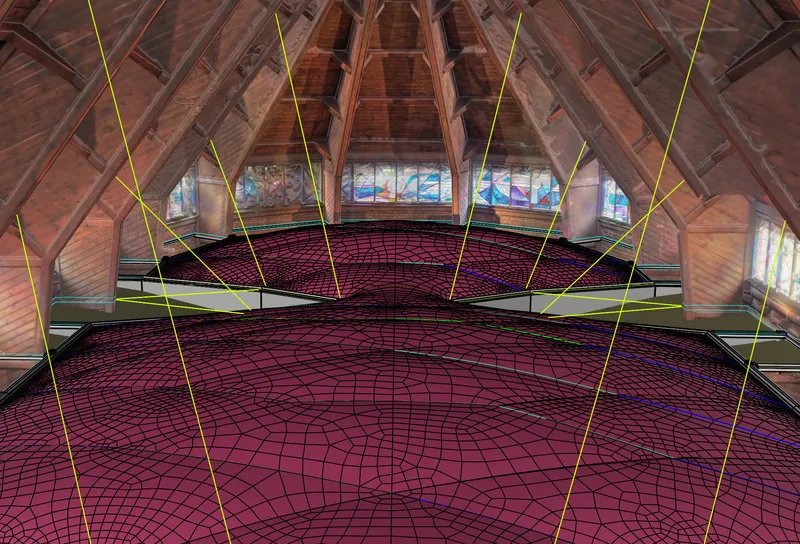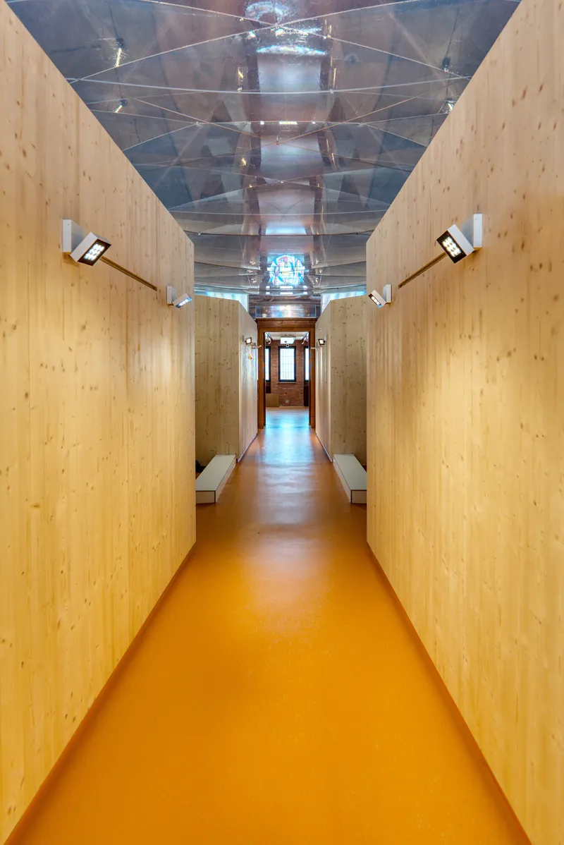 The substructure of the cushion consists of a very slim, surrounding frame profile, between which a thin, form-defining cable net istensioned. The lightweight construction is deliberately restrained to maintain the spatial feeling of the nave and to comply with heritage conservation requirements.