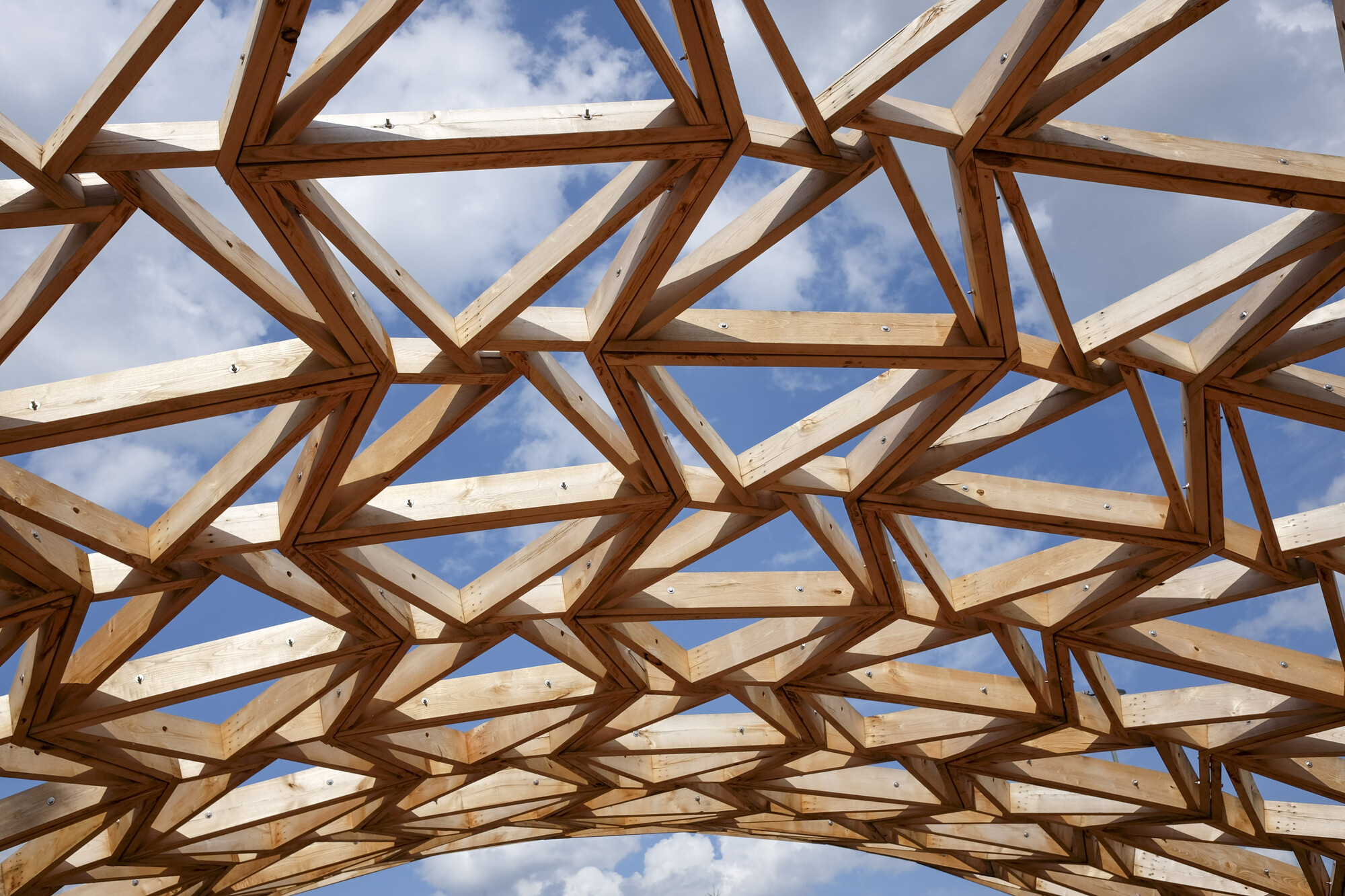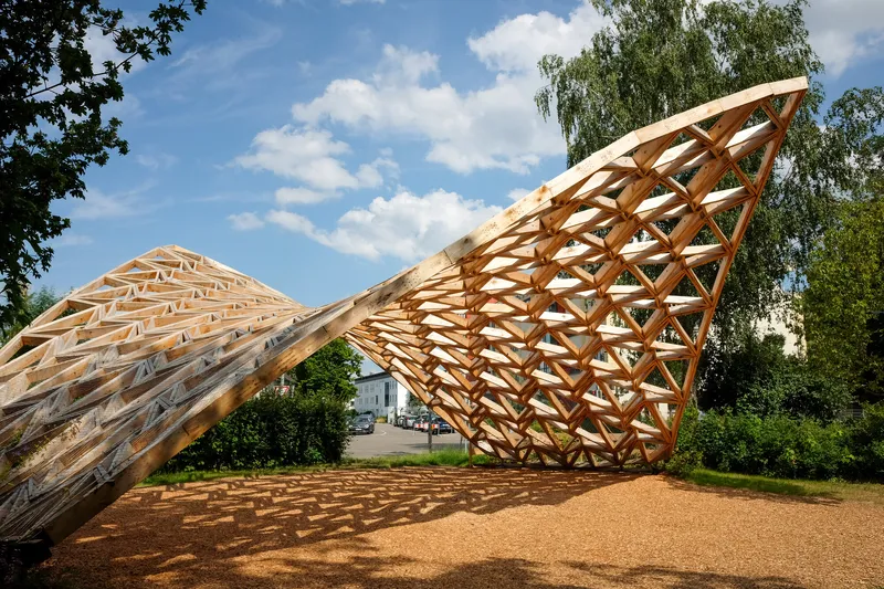 Geodesic hypar shell made of sweet chestnut wood – a combination of efficient load transfer, precise digital fabrication, and minimal material use