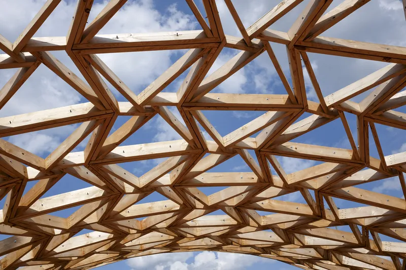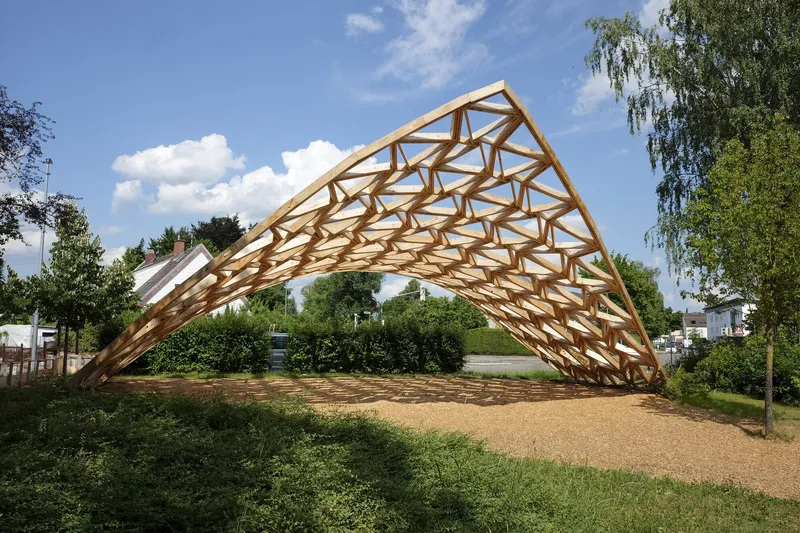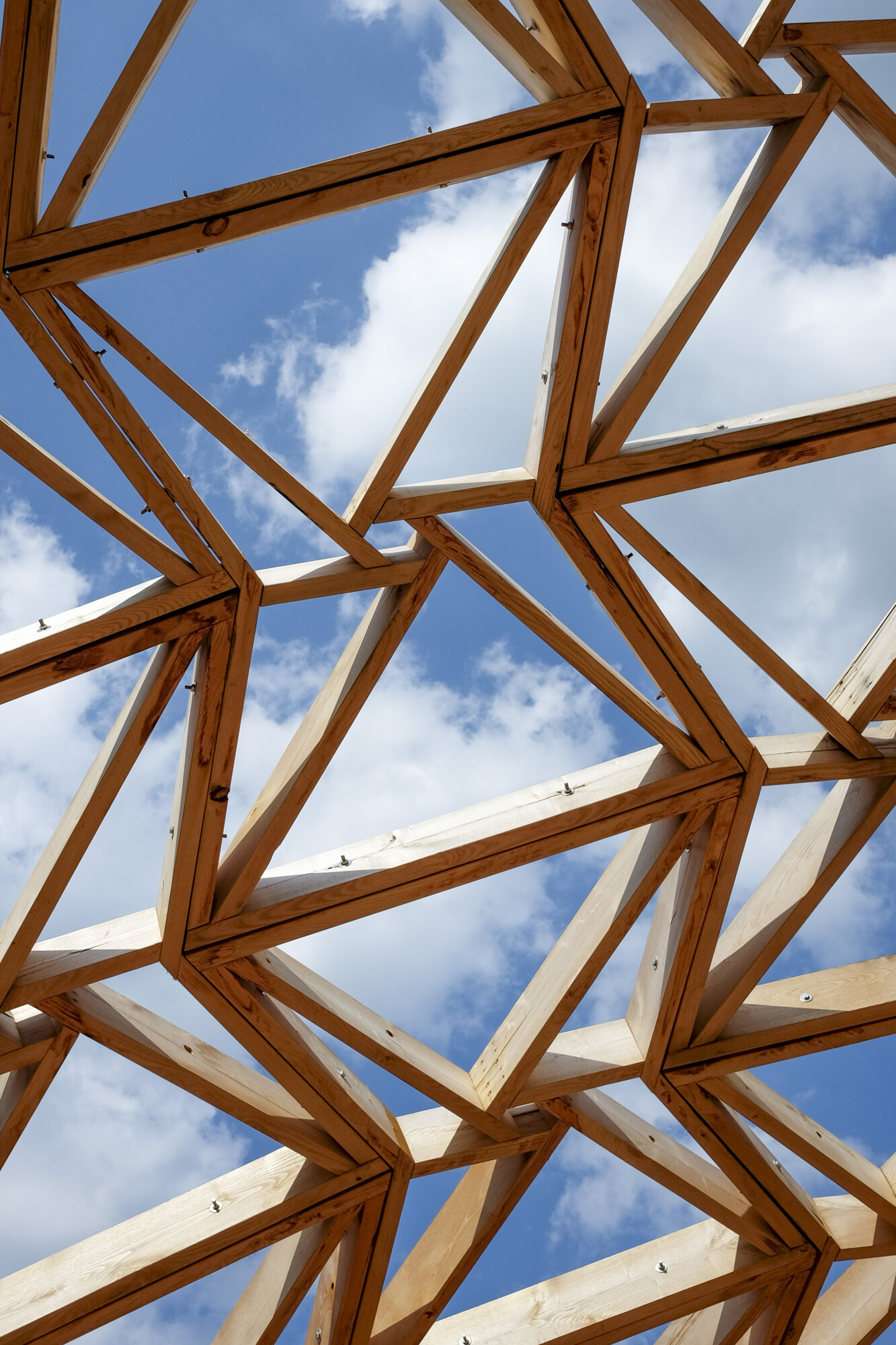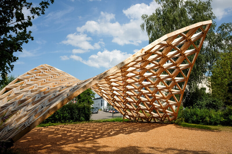 A central aspect of the construction of the weather-exposed load-bearing structure is the improved wood protection achieved through the use of spacers. All struts are spaced evenly 8 mm apart, allowing for necessary ventilation and protecting the wood surface from weather influences. This measure helps minimize the risk of moisture accumulation and resulting damage, ensuring the longevity of the wooden structure. The connections were made using stainless steel connectors and screws with special coatings due to the high tannin content of the wood.