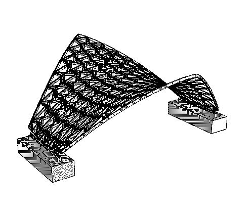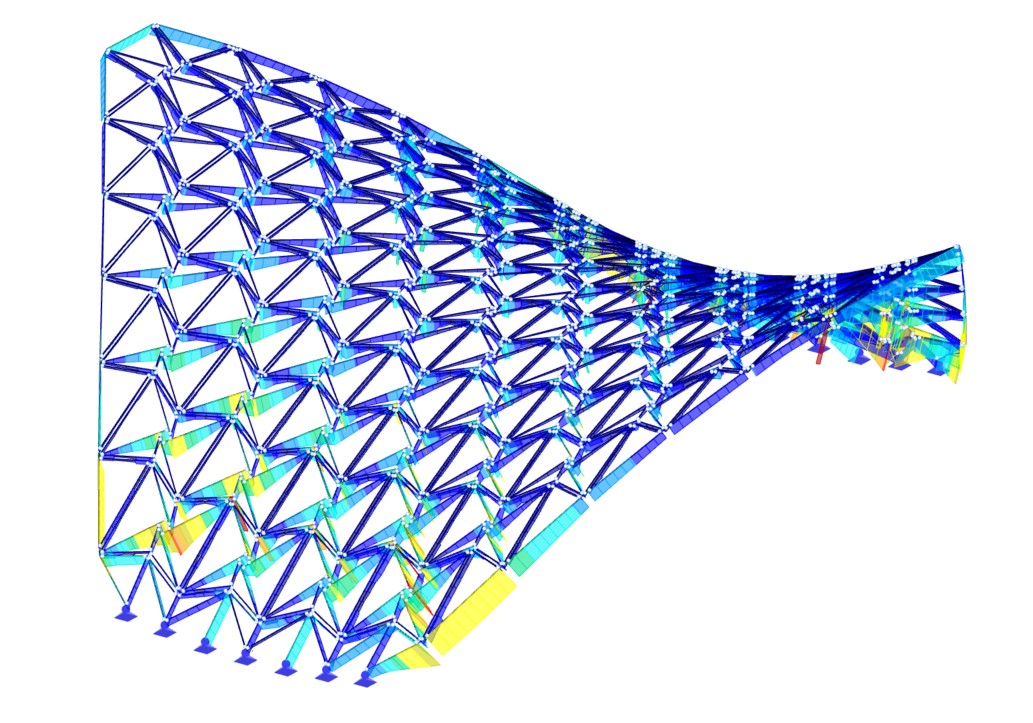 For the static design of the grid shell, the permanent structure was dimensioned to withstand full wind and snow loads to ensure long-term operation under various climatic conditions. As part of the design process, different modeling approaches of the structure were compared, and based on that, a model of the entire load-bearing structure was developed, including the flexible coupling of the double struts and individual connection points between the hexagons, as well as compression contacts with tensile failure, to represent a realistic and detailed load transfer.