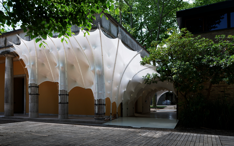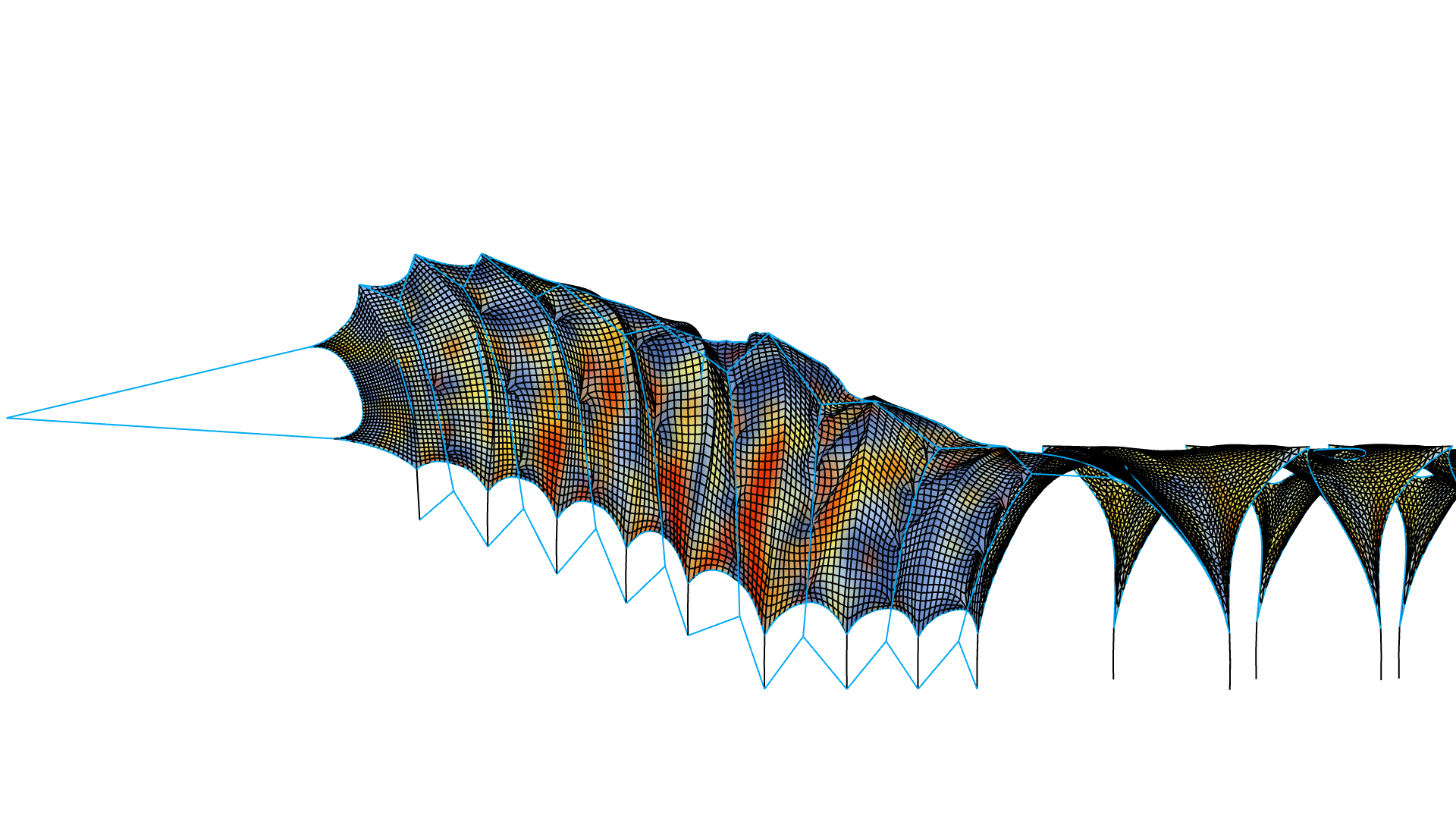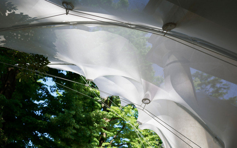 Structures are rarely mono-material or purely in tension or compression. Instead they are composed of multiple materials that each hold their own performance. In Isoropia, the forces in the bending active fibreglass rods are counterbalanced by the knitted textile system. Through the interaction of these two elements a stable equilibrium is established. Isoropia uses knit as a textile membrane. Knit is softer and less homogenous than traditional laminated membranes and its structure can be varied to create areas of more or less stretch.