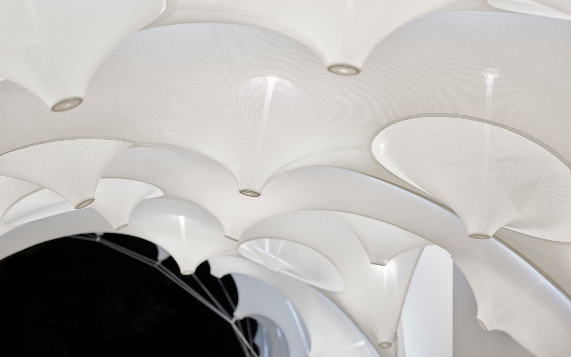 Isoropia - meaning balance, equilibrium and stability - is a finely tuned balance of tension and compression. Here, bespoke knitted textiles with varying material properties are embedded within actively bent fibreglass rods, finding together their equilibrium and form.