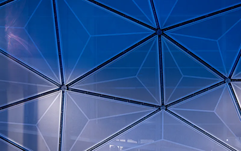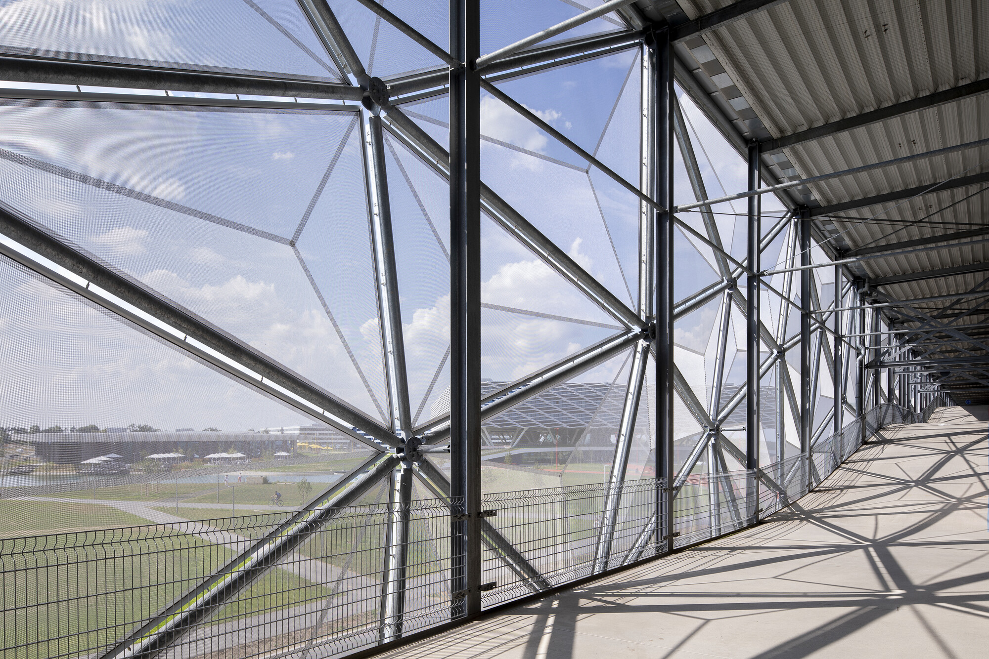 The nodes of the triangular mesh vary in distance to the main structure, thereby generating a 3-dimensional tessellated surface to give the façade a certain depth. A specially for this project produced mesh membrane was used to meet the criteria for smoke extraction. In the center of the supporting structure is an innovative “plug-in-connector” which was made possible by a parametric description and a consistent digital workflow that allowed the production of the geometrically complex steel structure.