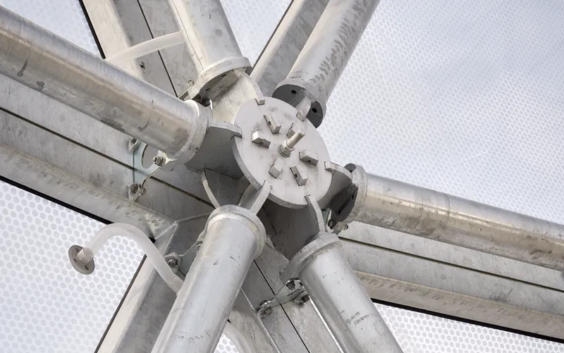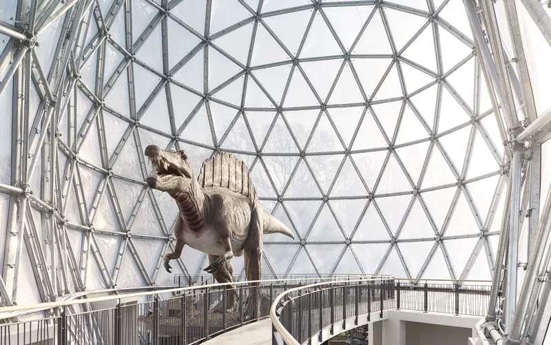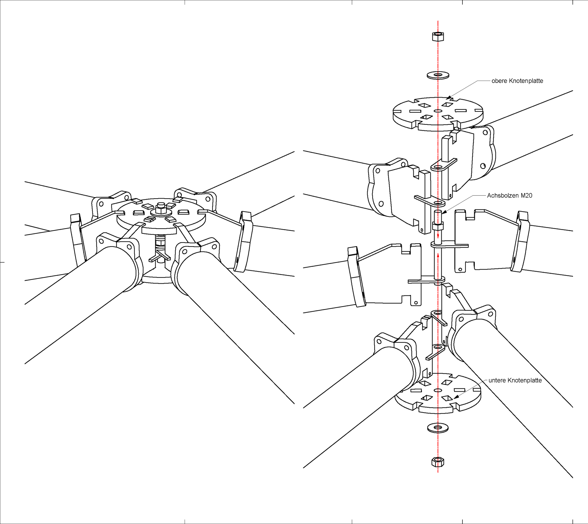 The new visitor center of the dinosaur park Kleinwelka near Bautzen consists of 3 fused steel domes with a covering of foil cushions. Deviating from the steel construction details specified in the tender, str.ucture worked with design-to-production to develop a node that took account of the fact that all the bar lengths and angles between the bars were different due to the design. This new digital detail was optimized and could ultimately be produced and assembled more economically than the conventional specification.