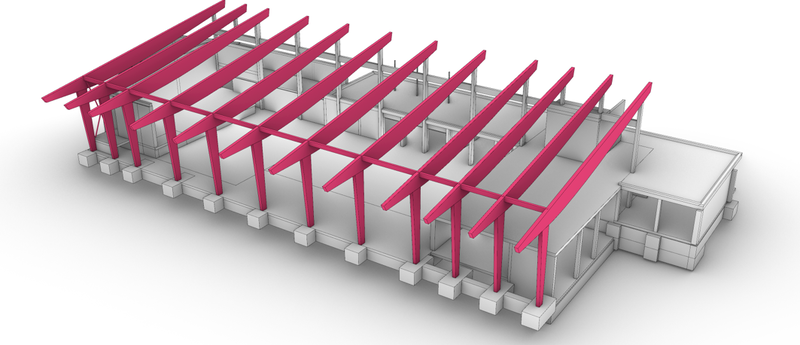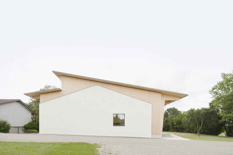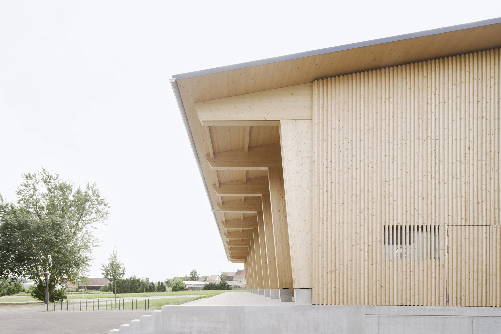 To the north of the hall, the glulam frame structure rests on the existing frame of the ancillary rooms from the 1960s.