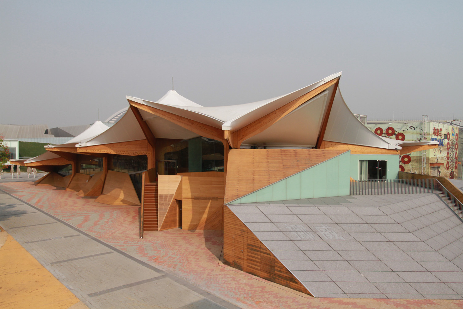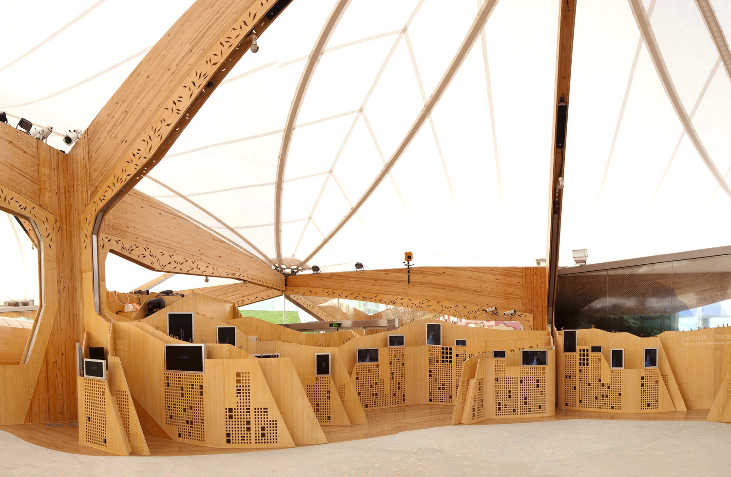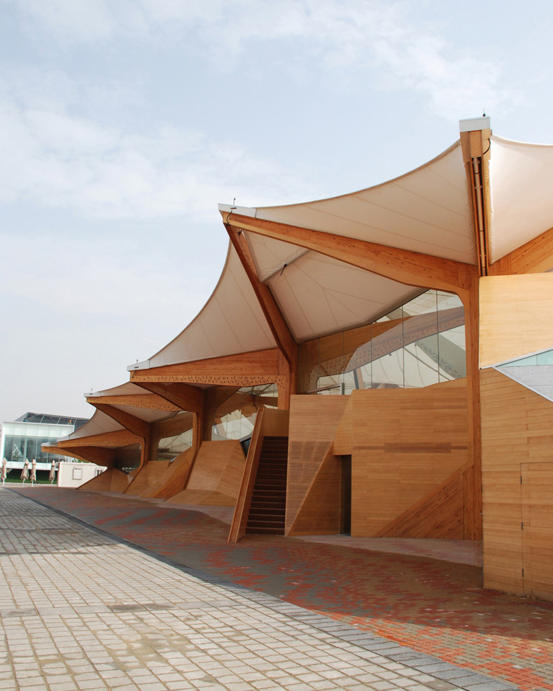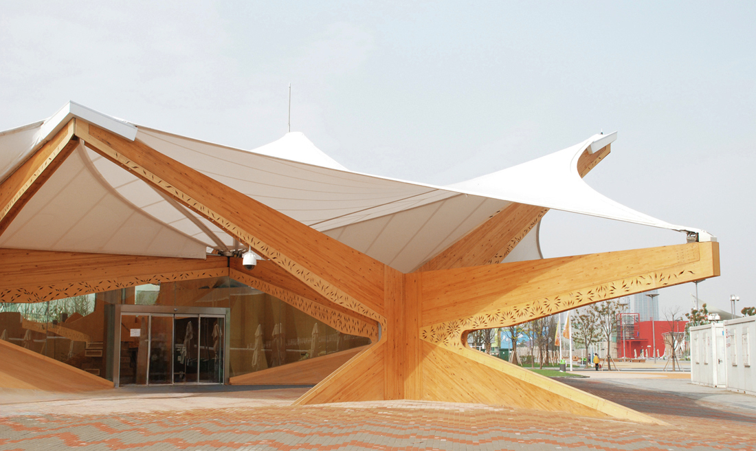 The supporting structure of the pavilion consists of 15 tree shaped elements. These laminated timber structures are covered with a PTFE membrane. The membrane covers an area of 2,500 m². The maximum span is 11 meters.