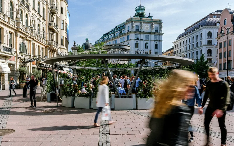 The elegant, elliptical design of the pavilion evolves from requirements of the urban planning management and refers to the adjacent historical monument “Svampen”.