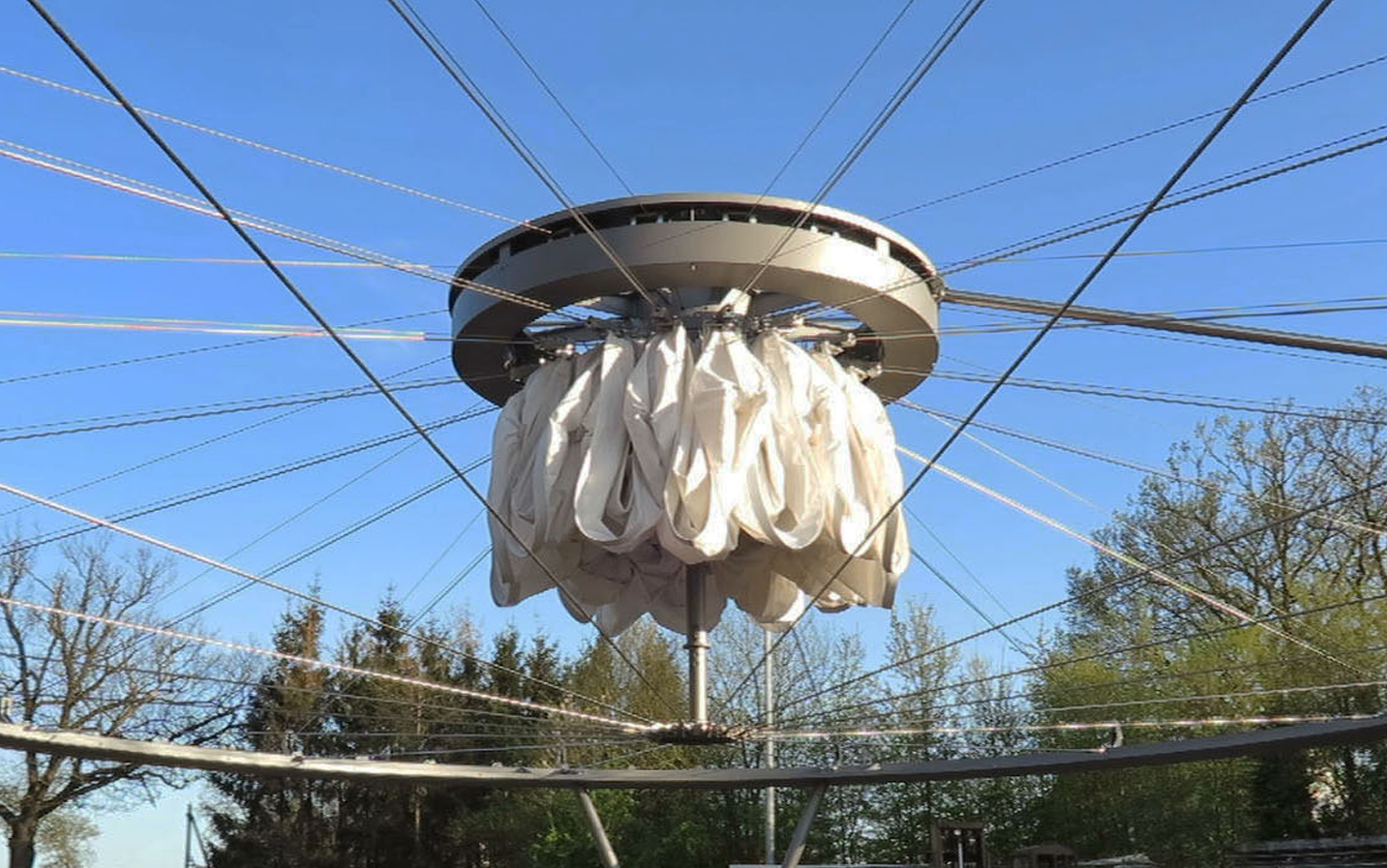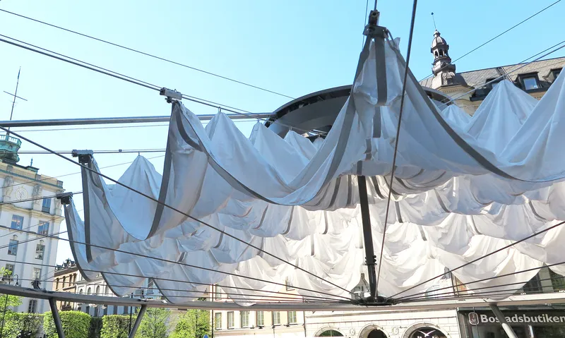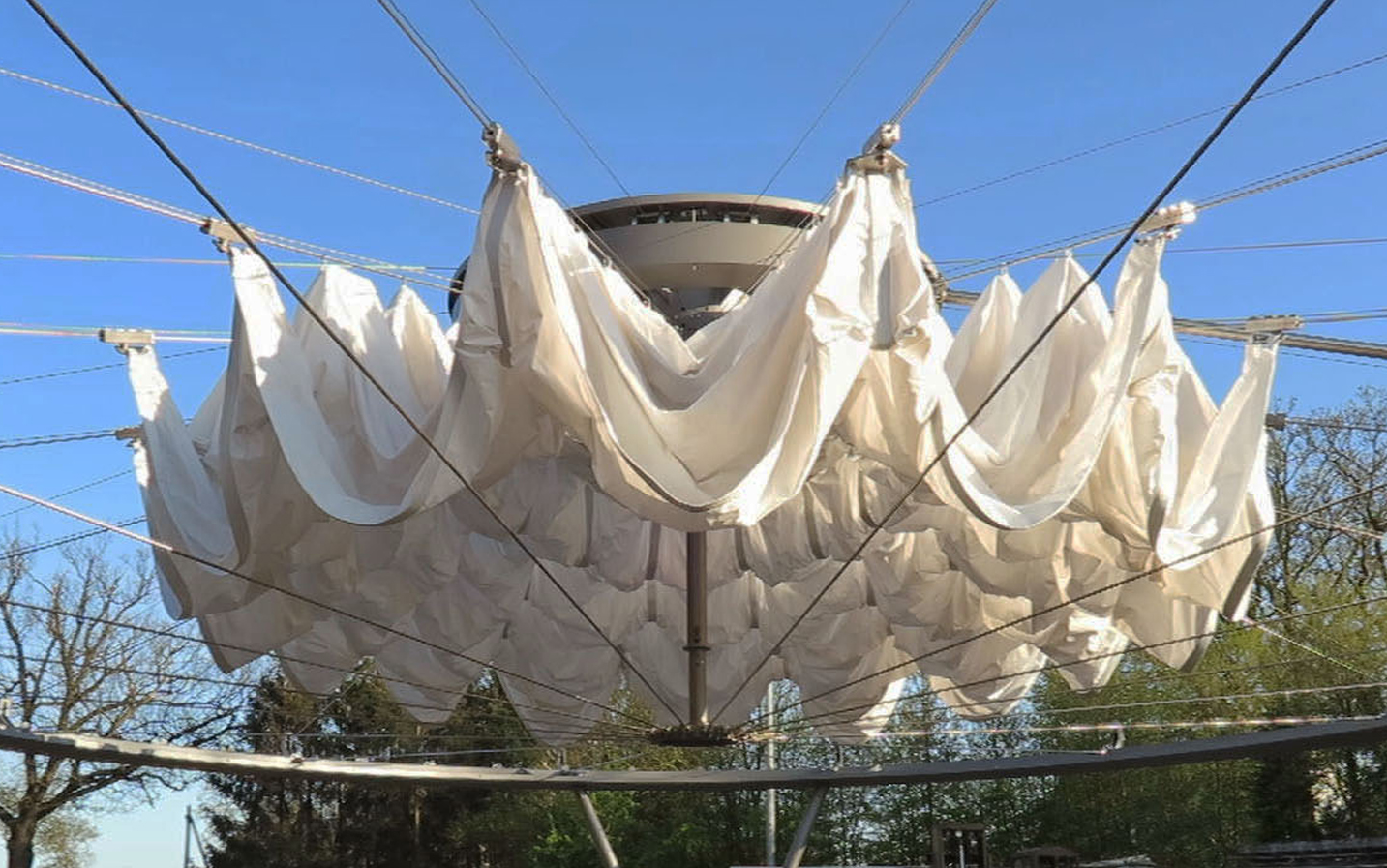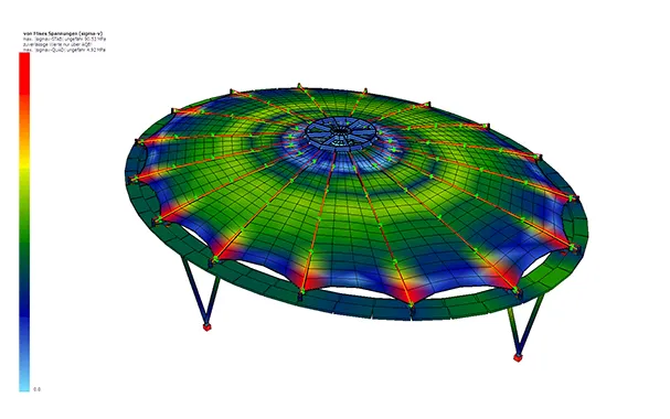 The steel construction consist of an elliptical girder on 4 v-shaped columns. A central free hanging support is carried by 16 prestressed steel cables. The membrane is deployed and retracted on the stainless steel spoke cables. A new type of central driving unit was developed capable of moving and prestressing the membrane with only one electric motor.