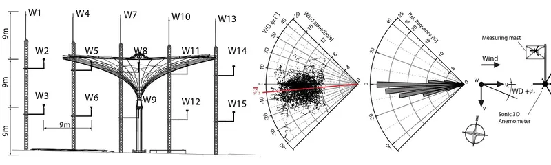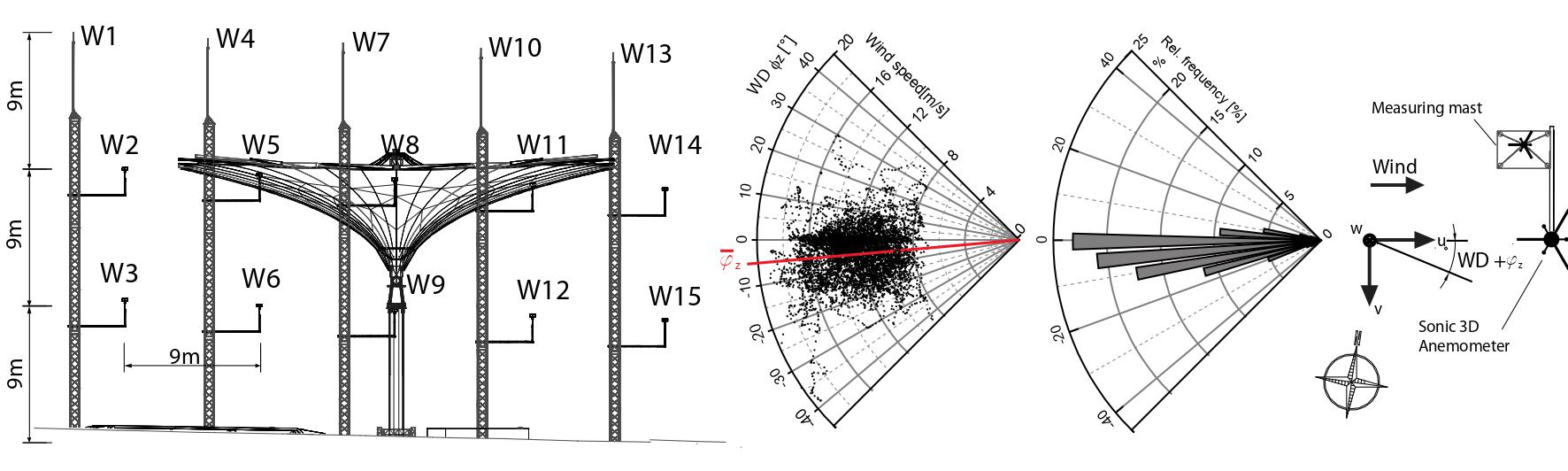 For this purpose, the load rating of the parasol prototype was calculated based on natural scale under transient wind load and compared with measurements of experimentally calculated internal forces and deformations. The test has shown that a reliable forecast of rated values on the basis of computer-aided wind simulation methods is feasible.