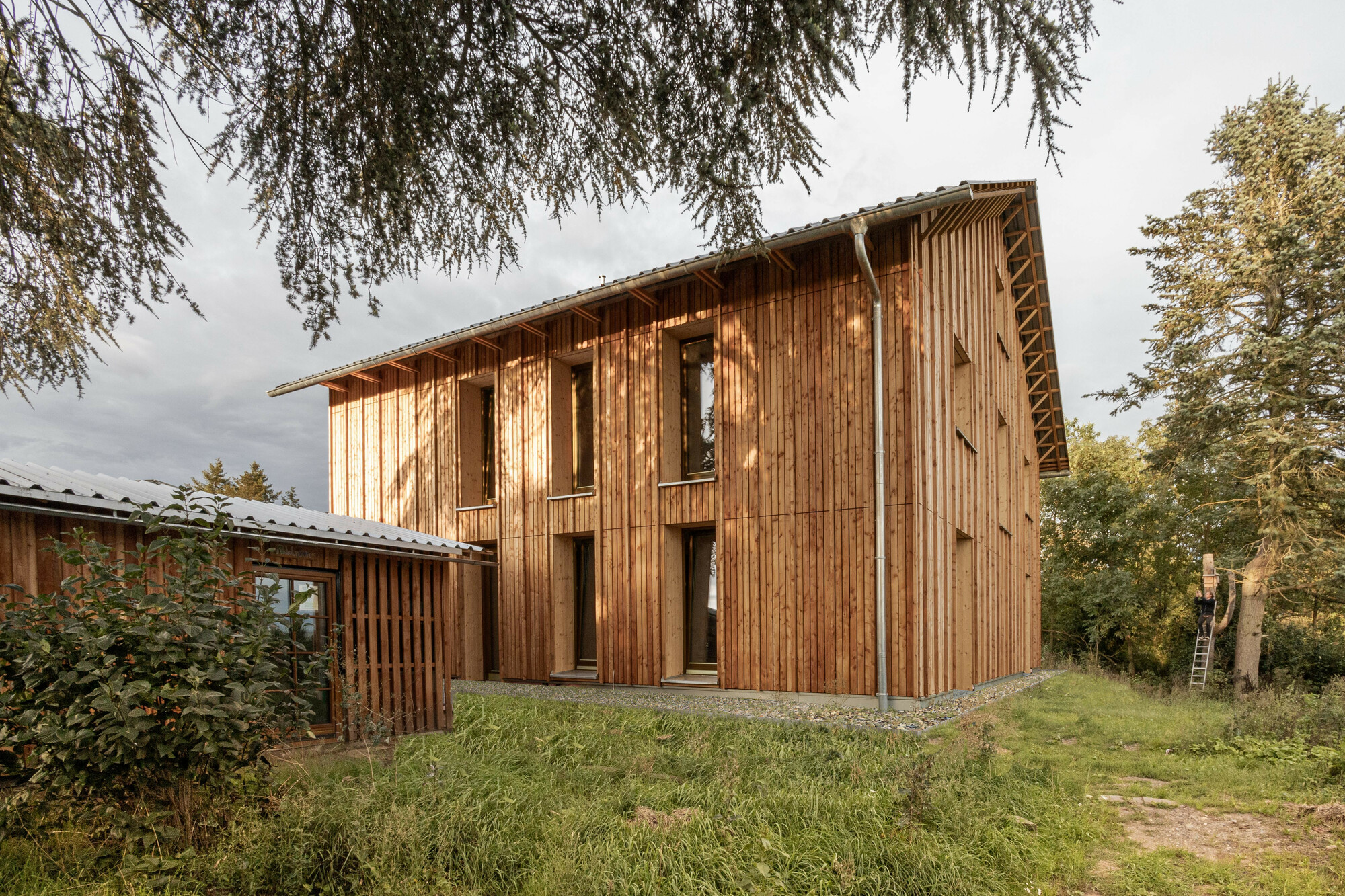 Das Betriebsgebäudes der Gärtnerei Petersilie im Außenbereich der Gemeinde Oberweimar umfasst in der Nutzung neben den Aufenthaltsräumen für das Gärtnerei-Team auch Tagungsräume sowie Wohnräume in den Obergeschossen. Der Neubau wurde auf dem Kellergeschoss des ehemaligen Betriebsgebäudes errichtet. Hierzu wurde das Bestandsgebäude inklusive der Bodenplatte zurück gebaut. Die Bodenplatte wurde neu erstellt, um die Einwirkungen aus dem Gebäude sicher in das bestehende Kellermauerwerk und den Boden abzutragen. Oberhalb der Bodenplatte wurde ein offener Grundriss in Holzleichtbauweise mit Strohdämmung umgesetzt. In den vertikal geteilten Ständern der Außenwände wurde eine Dämmstärke von 36,5 cm erreicht. Die Konzeption des Tragwerks und der Konstruktion wurde darauf ausgelegt, dass wesentliche Teile von einem Holzbauunternehmen vorgefertigt werden konnte, aber eine Eigenleistung durch die Nutzer*innen des Glashüpfer e.V. genauso möglich wurde. So konnte insbesondere das Einbringen der Strohdämmung und die außenliegende Verschalung aus Lärchenholz sowie der Innenausbau in Eigenleistung erbracht werden.