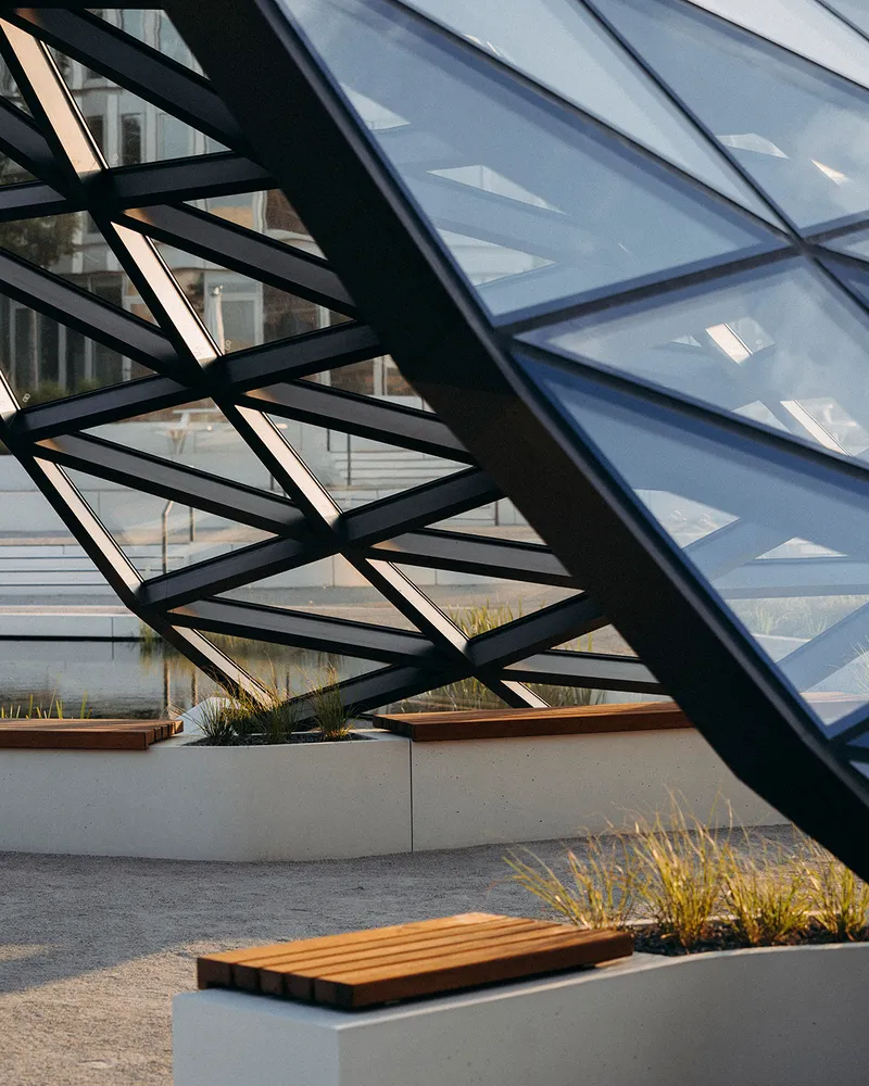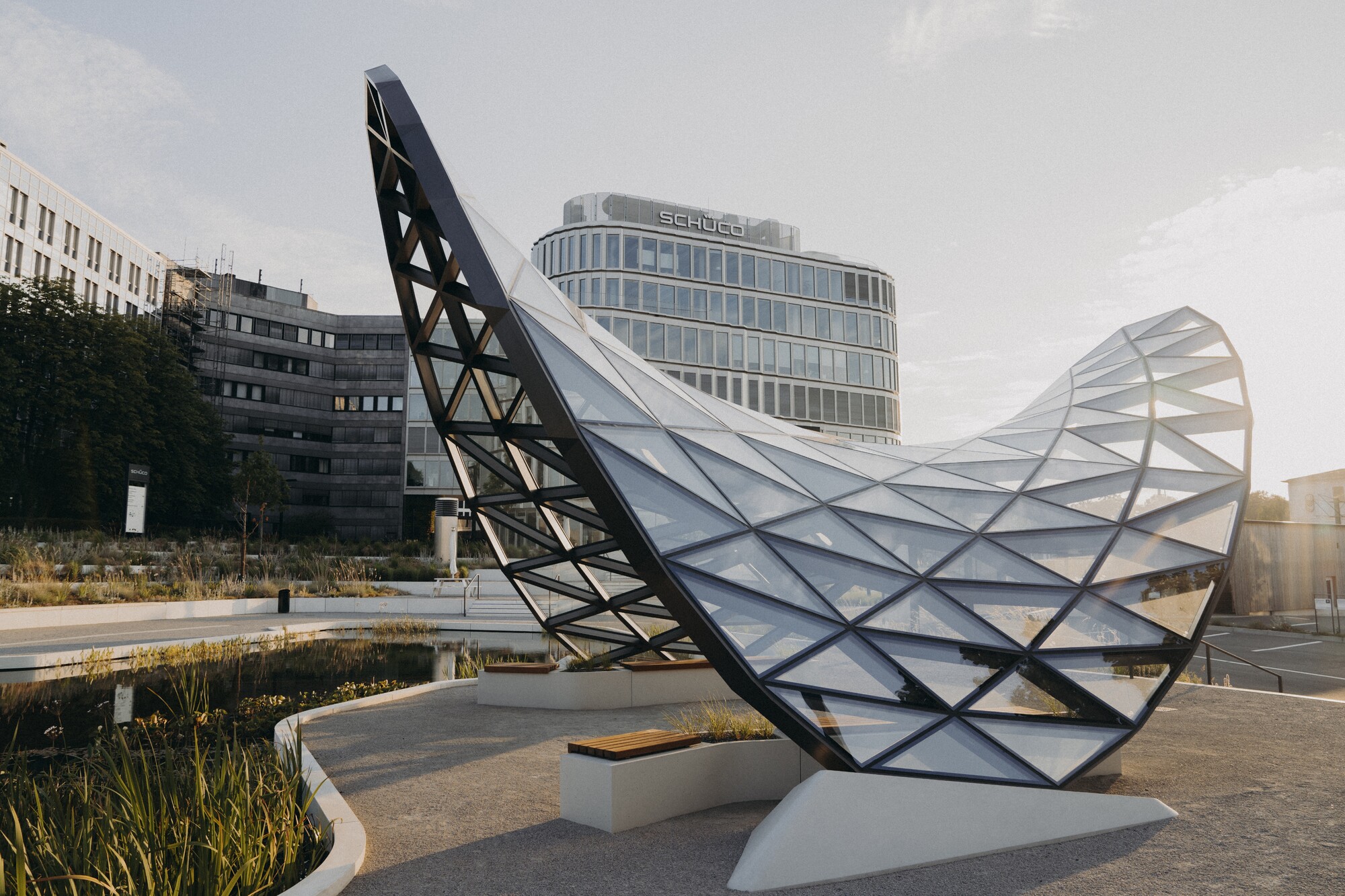 Im Zuge der BAU 2023 präsentierte Schüco ein konstruktiv anspruchsvolles Grid2Shell-Exponat. Nach dem sorgfältigen Rückbau wurde die Struktur eingelagert, mit dem Ziel einer späteren Weiternutzung. Neben der statischen Berechnung für Ausstellungszwecke im Rahmen der BAU 2023, übernahmen wir auch die statische Neubewertung unter abweichenden Randbedingungen auf dem Schüco Campus in Bielefeld. Dadurch konnte das bestehende Tragwerk nachhaltig weiterverwendet und funktional in die neue Umgebung integriert werden.