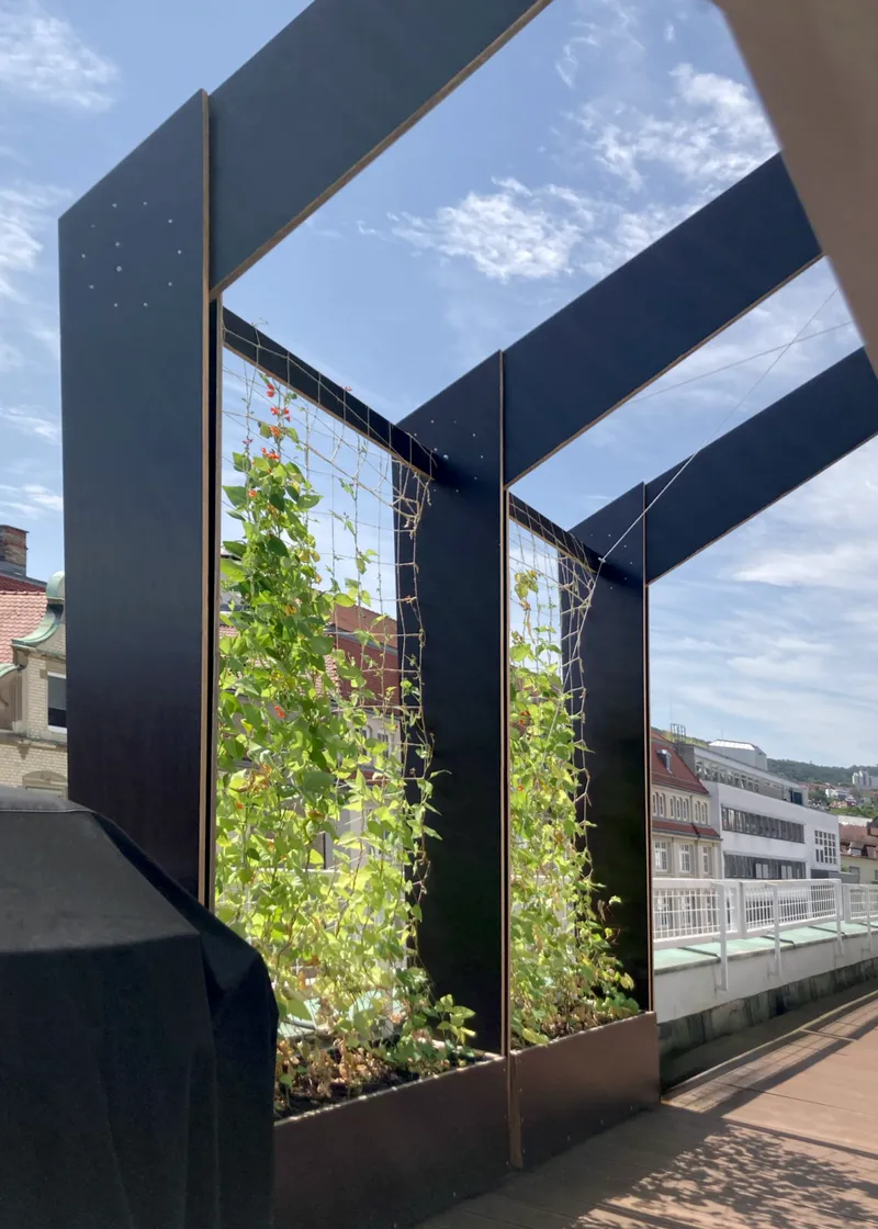 Die erste str.auch Rankhilfe entstand im Frühjahr 2024 auf unserer eigenen Büroterrasse. Dort konnten wir ausprobieren, wie das System aufgebaut, bepflanzt und im Alltag genutzt wird. Seit 2025 wächst der erste offizielle Prototyp auf der Etzelfarm in Stuttgart.