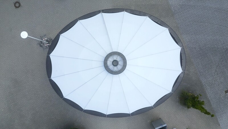 Unser textiler Seilschirm ist eine standortunabhängige Konstruktion, die als Versuchsanordnung zur Klärung technischer und ästhetischer Fragestellungen dient. Mit einer zentral raffbaren Membrane und einer Fläche von ca. 112m² eignet sich diese Lösung für viele städtische Situationen.