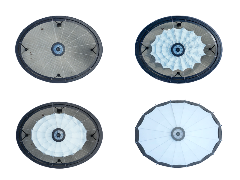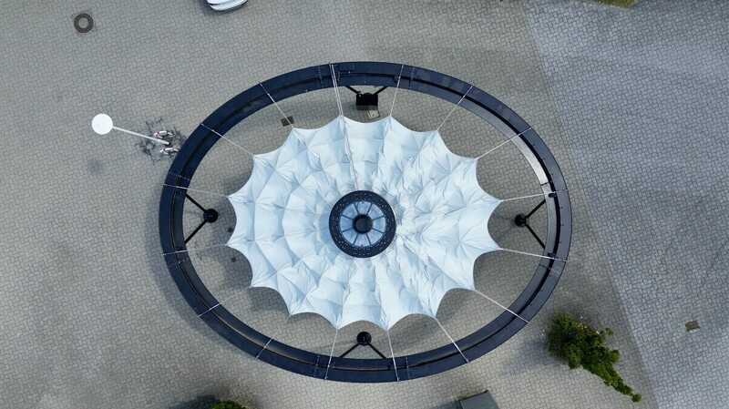Der Seilschirm basiert auf einer elliptischen Geometrie mit achssymmetrischer Membranform. Der zentrale Mast fungiert als Luftstütze und ist mit radial angeordneten Seilen gespannt. Gemeinsam mit den oberen Tragseilen entsteht ein vorgespanntes „Speichenrad“ in elliptischer Form. Die Membrane ist an den oberen Speichenseilen aufgehängt und kann über einen zentralen Antriebsmechanismus und Reffsiele bewegt werden. Diese Antriebstechnik befindet sich im oberen Teil der Luftstütze und dient gleichzeitig als Regenschutz für die gefaltete Membrane im geöffneten Zustand.