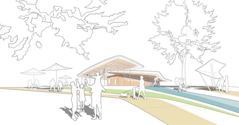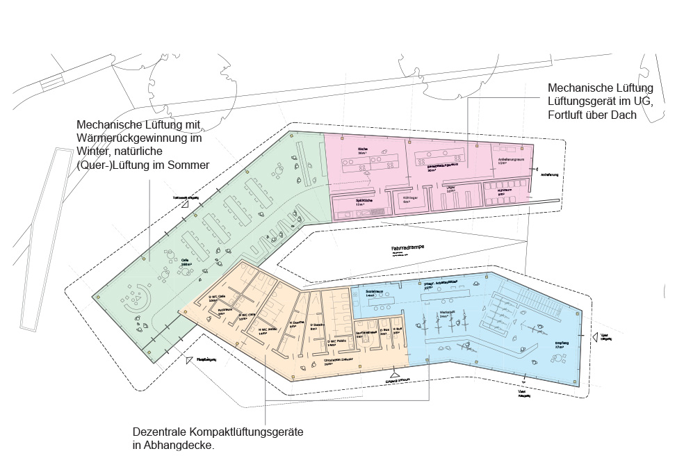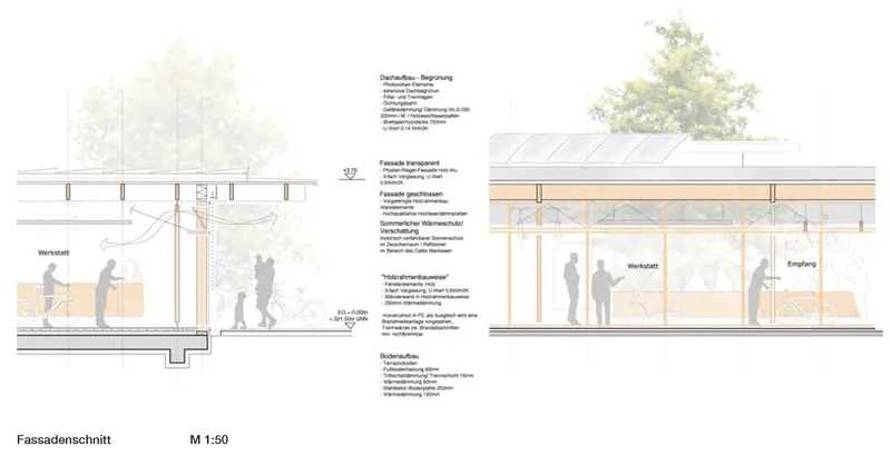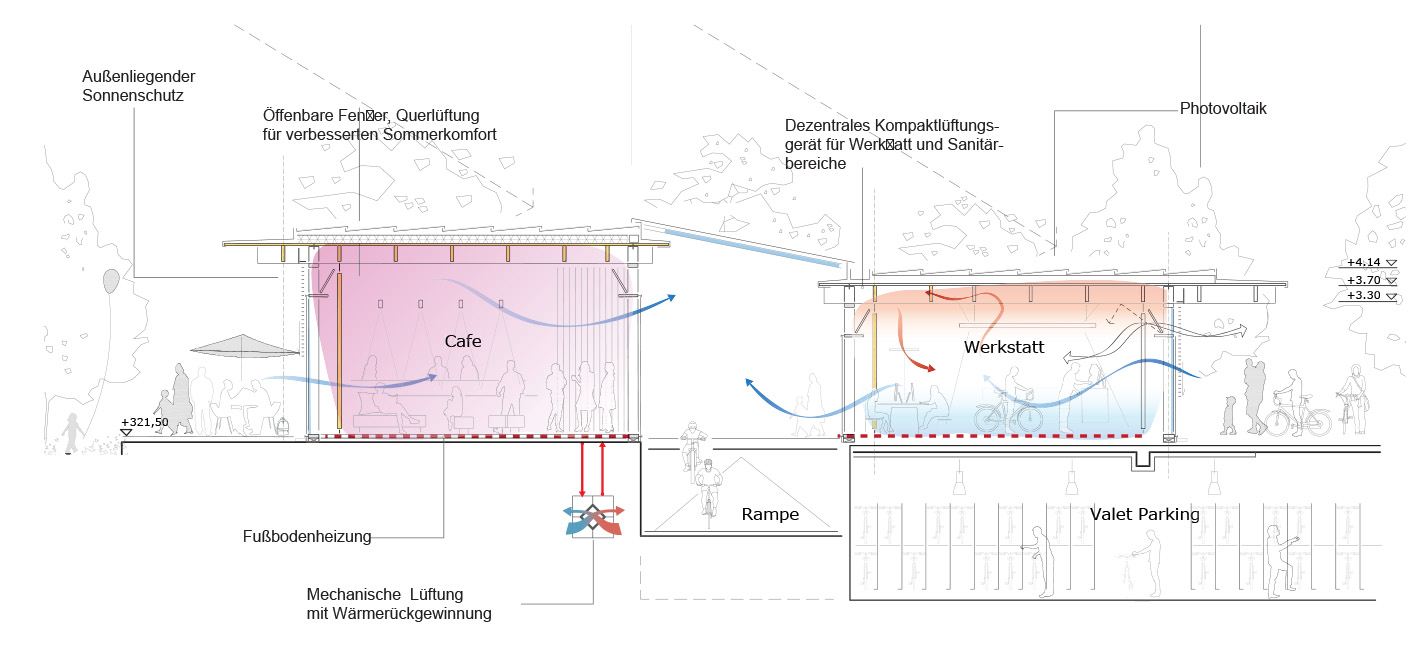 Radstation mit Gastronomie, Werkstätten und Valetparking für Fahrräder im Untergeschoss.