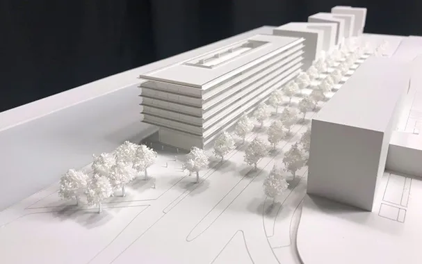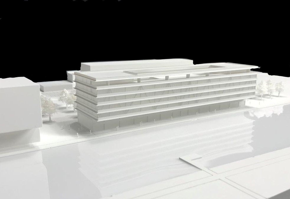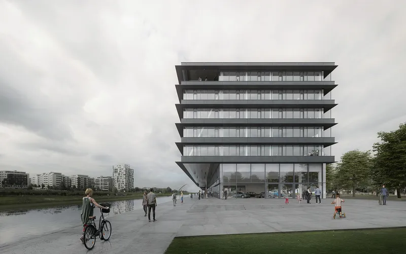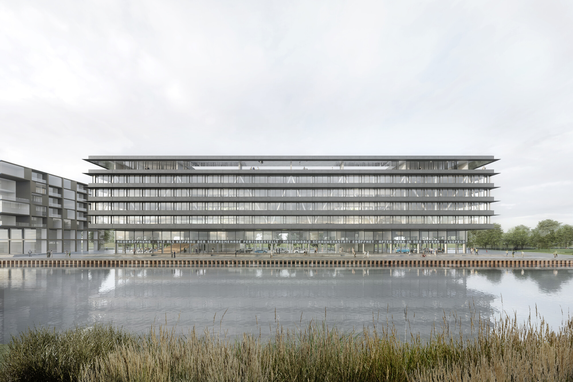 Neubau eines 5-geschossigen Bürogebäudes in Skelettbauweise auf gläsernem Sockel.