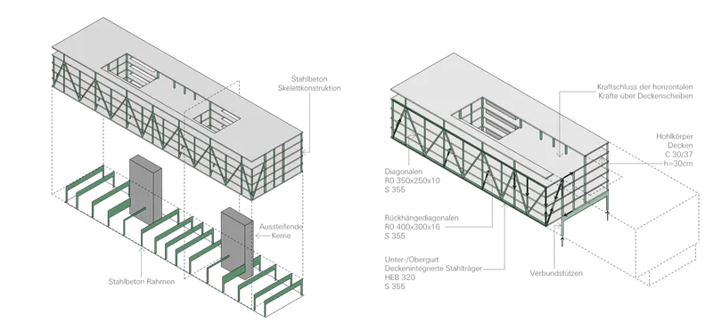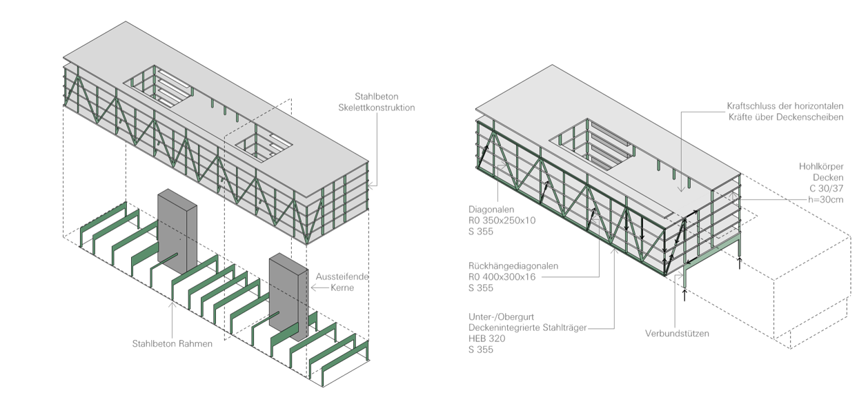 Die Anforderungen an das Tragwerkskonzept charakterisieren sich durch die 8 m auskragenden Obergeschossen über dem EG-Riegel sowie der stützenfreien Überspannung der Werkstattsituation im EG in Gebäudequerrichtung über 18 m. Die gewählte Skelettbauweise in Stahlbeton mit einem integriertem, geschossübergreifenden Stahl-Fachwerkträger in der Fassadenebene, der punktuell zurückgehängt wird, reagiert effizient und filigran auf die statische Situation. Die Abstimmung der Anordnung der rückhängenden Diagonalen mit den innenliegenden Lichthöfen erlaubt dabei eine maximale Flexibilität des Grundrisses in Bezug auf die Nutzung und ermöglicht eine Ablesbarkeit des Kraftflusses im Gebäude sowie der Fassade. Die Abfangung der Obergeschosse über der Werkstatt/Showroom erfolgt über schlanke Stahlbetonträgern, die im Stützenraster angeordnet sind.
